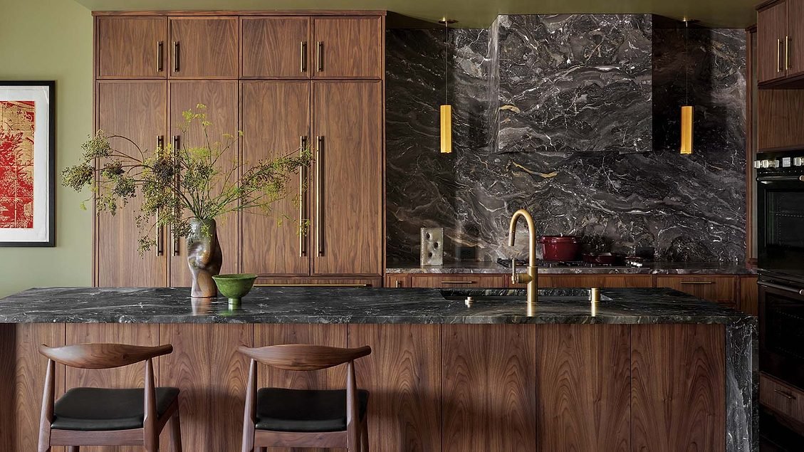 Nhà bếp bao gồm đá cẩm thạch Orobico và đồ gia công bằng gỗ óc chó tùy chỉnh (1, 2 và đầu trang). Hình ảnh © Brendan Mainini, bấm vào để phóng to.