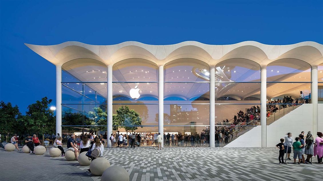 Stores of the latest generation center sustainability and well-being, reflecting the priorities of Tim Cook, who took over as CEO in 2011 and has since expanded the company’s focus on wearables (such as the Apple Watch and Apple Vision Pro), services, and entertainment. Visitors can now frequently find stores lined with warm oak and planted with stands of indoor trees, while polished steel reflects the greenery. The hemispherical Apple Marina Bay Sands (2020) in Singapore and Apple The Exchange (2024) in Kuala Lumpur, Malaysia, employ louvers to modulate daylight and enhance building performance. The Fifth Avenue flagship, renovated a third time, by Foster + Partners in 2019, reflects these ideals too. The store’s footprint was nearly doubled to keep up with ever increasing foot traffic, and plaza-integrated skylights added to naturally brighten the interiors. Apple claims that its stores are now all carbon neutral, and the Ring, in Cupertino, one of the largest LEED Platinum–certified buildings in the U.S., is entirely powered by renewable-energy sources.