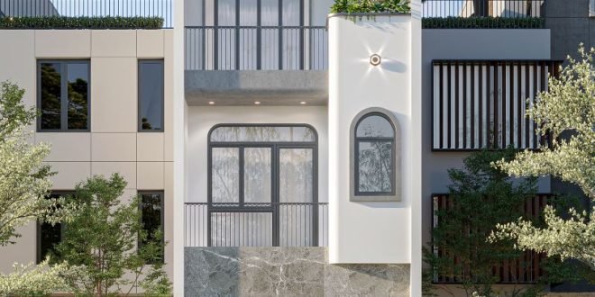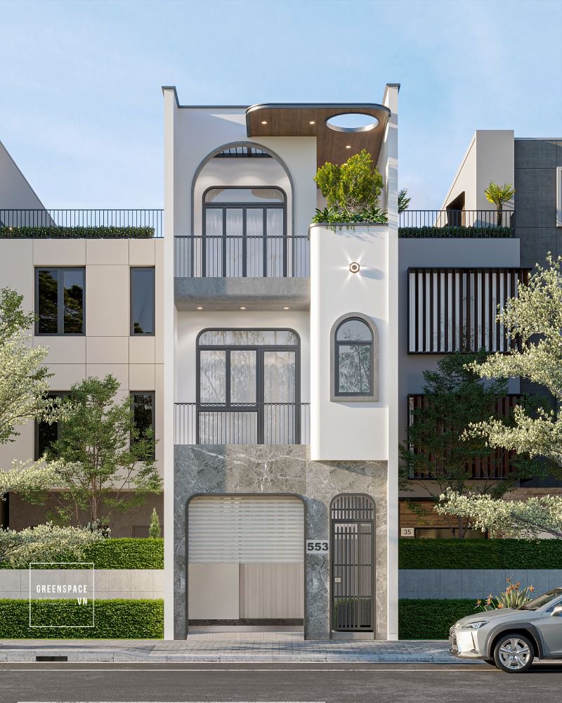 Mặt tiền nhà phố hiện đại nổi bật với hình khối vòm cong mềm mại kết hợp mảng tường phẳng tinh giản. Gam màu trắng chủ đạo phối đá ốp xám tạo cảm giác sang trọng và bền vững theo thời gian. Ban công bố trí lan can sắt thanh mảnh giúp mặt đứng nhẹ nhàng và thoáng đãng hơn. Tầng trên cùng thiết kế mái đua kết hợp trần ốp gỗ tăng điểm nhấn thẩm mỹ. Cây xanh được bố trí xen kẽ các tầng mang lại sự cân bằng và cảm giác sống gần thiên nhiên.