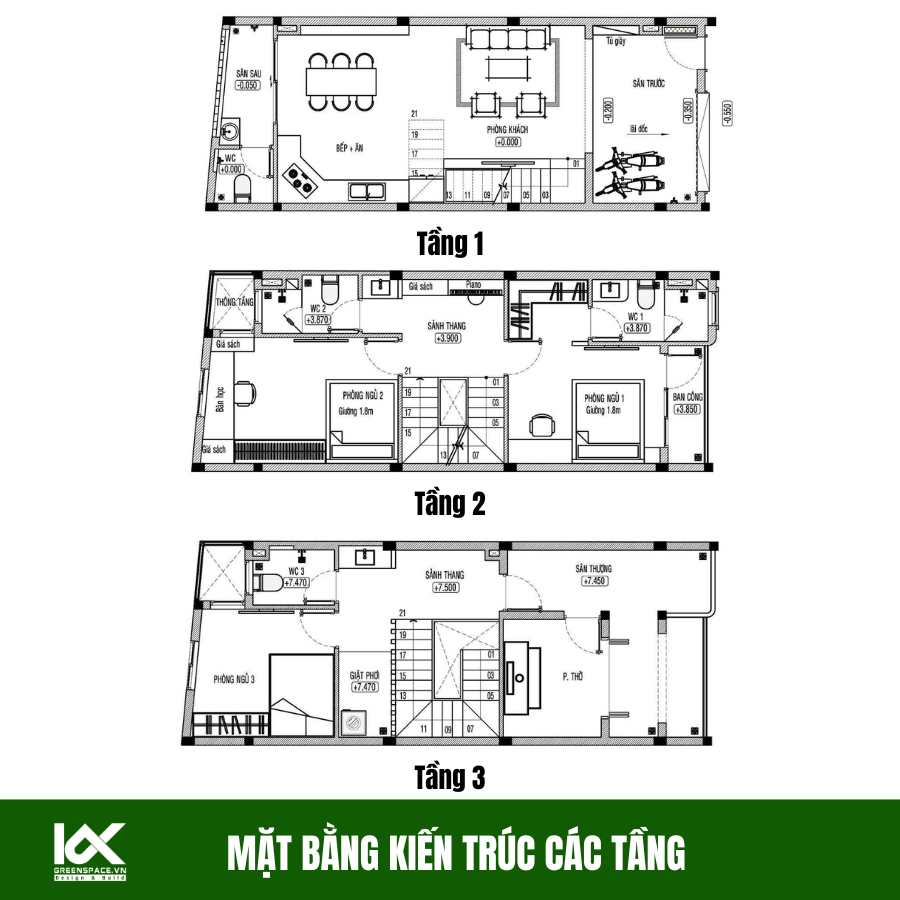 Mặt bằng tầng một bố trí sân trước để xe, phòng khách liên thông bếp ăn tạo không gian sinh hoạt rộng rãi. Khu bếp kết hợp sân sau giúp thông thoáng, lấy sáng và hỗ trợ thông gió tự nhiên hiệu quả. Tầng hai bố trí hai phòng ngủ riêng tư, mỗi phòng có vệ sinh và ban công lấy sáng. Sảnh thang trung tâm giúp giao thông thuận tiện và kết nối các không gian chức năng. Tầng ba gồm phòng ngủ, phòng thờ và sân thượng phục vụ sinh hoạt và thư giãn.
