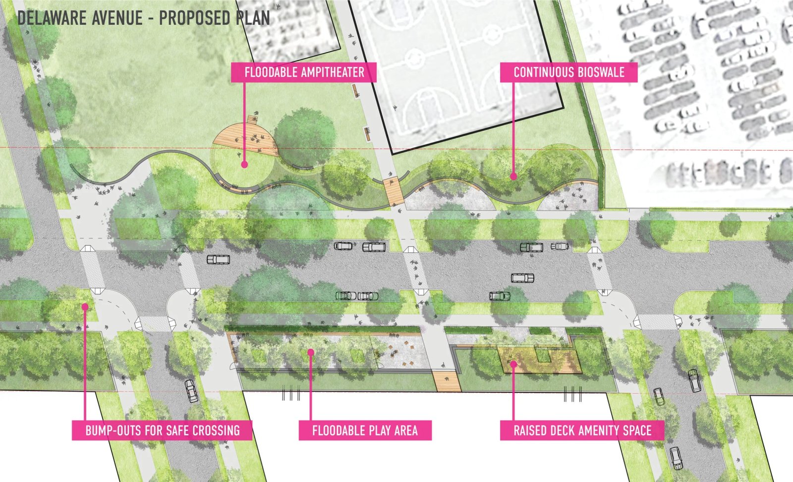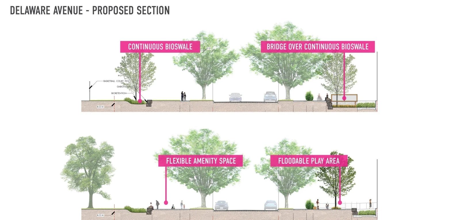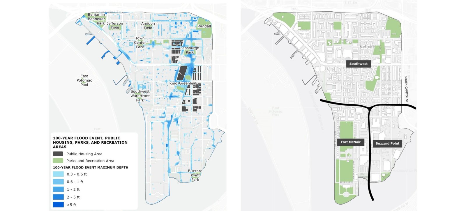 Chiến lược chống lũ lụt ở vùng Tây Nam & Buzzard Point thực hiện hành động để bảo vệ các cộng đồng dễ bị tổn thương nhất ở Washington, DC khỏi các sự kiện lũ lụt nội địa do biến đổi khí hậu khắc nghiệt gây ra. Dự án đột phá này—một trong những dự án đầu tiên trên toàn thế giới và đầu tiên ở Washington, DC—mang lại hình thức, ở quy mô khu vực lân cận, cho cơ sở hạ tầng thoát nước mưa mà các thành phố sẽ cần trong tương lai.