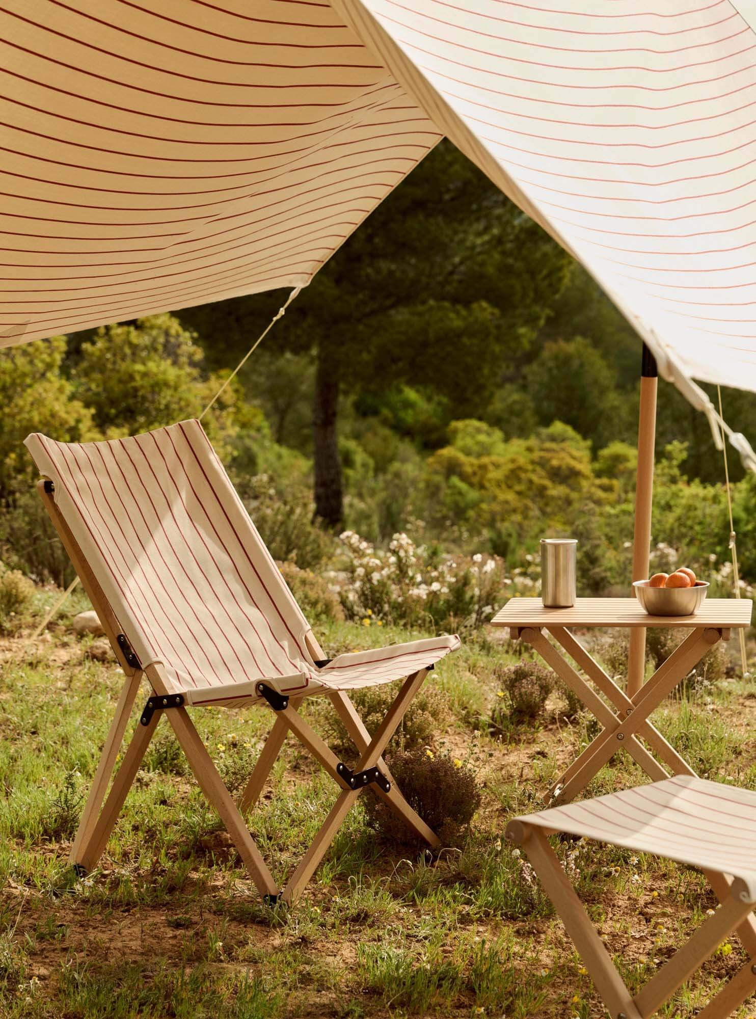 Lấy cảm hứng từ dụng cụ cắm trại hoài cổ, bộ sưu tập này của Jasper Morrison Shop dựa trên khung gỗ sồi nhẹ và polyester tái chế có sọc.