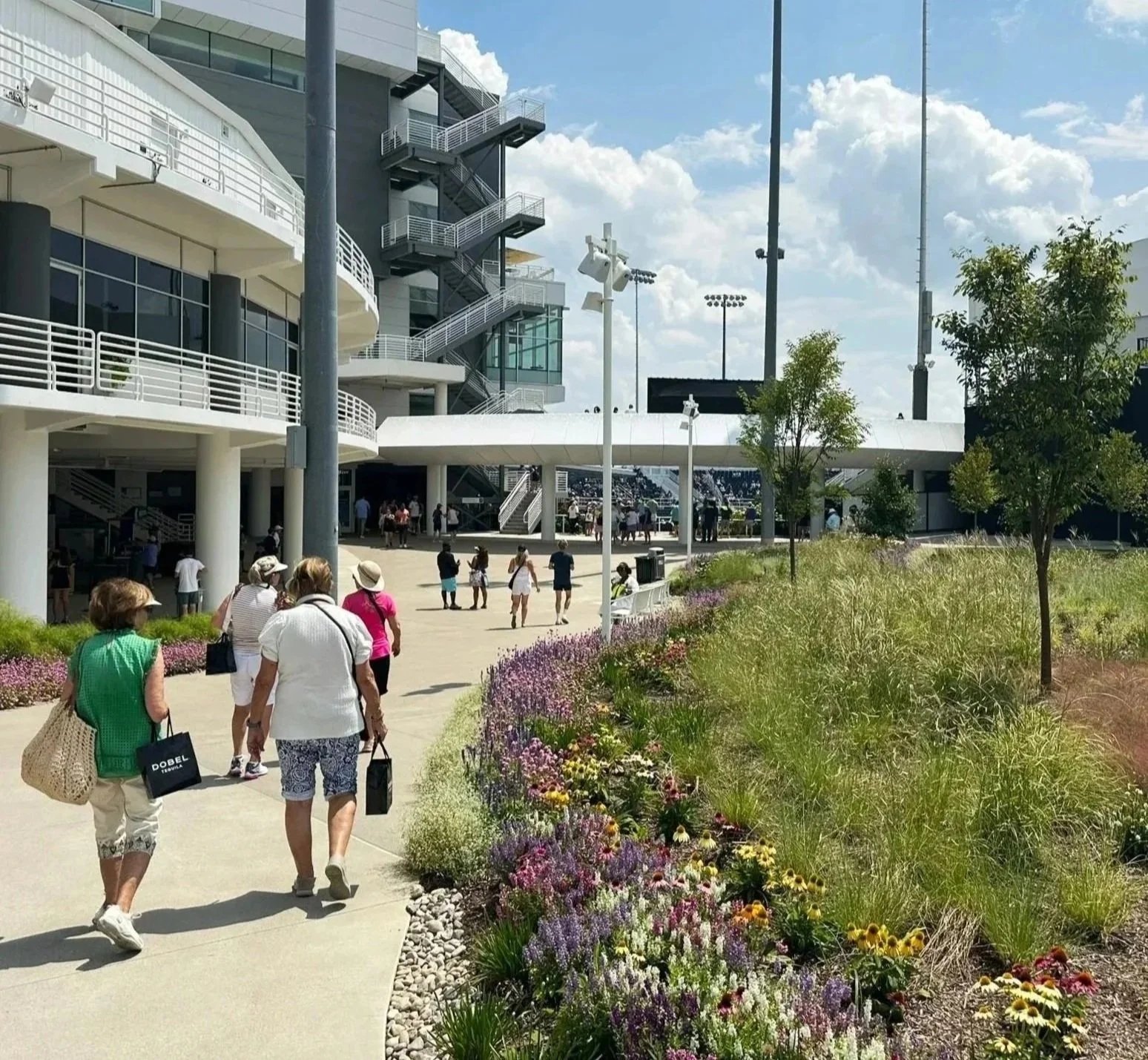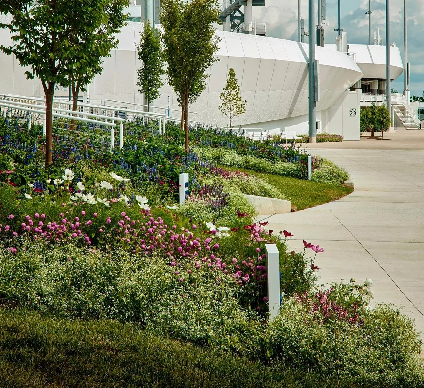 Trình tự lối vào cung cấp một quảng trường tuyến tính thân thiện và năng động–“Topspin Plaza”–chào đón người hâm mộ và du khách vào khuôn viên trường, đồng thời đóng vai trò là phòng chờ chính với các biển báo và chiến lược tìm đường được nâng cấp, một con hẻm rợp bóng cây với các khu vực ngồi và tụ tập, cùng một số yếu tố trải nghiệm của người hâm mộ. Quy hoạch tổng thể cũng tích hợp liền mạch việc bổ sung sân vận động chìm 2.000 chỗ ngồi mới nằm ở cuối phía nam của khuôn viên, được bao quanh bởi các cây cảnh mới và tán cây liền kề với quảng trường cổng vào phía nam– “Backspin Plaza”–kết hợp ngôn ngữ thiết kế tương tự như Topspin Plaza ở phía bắc.