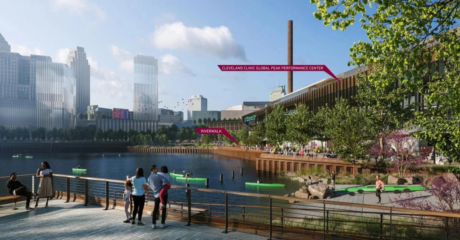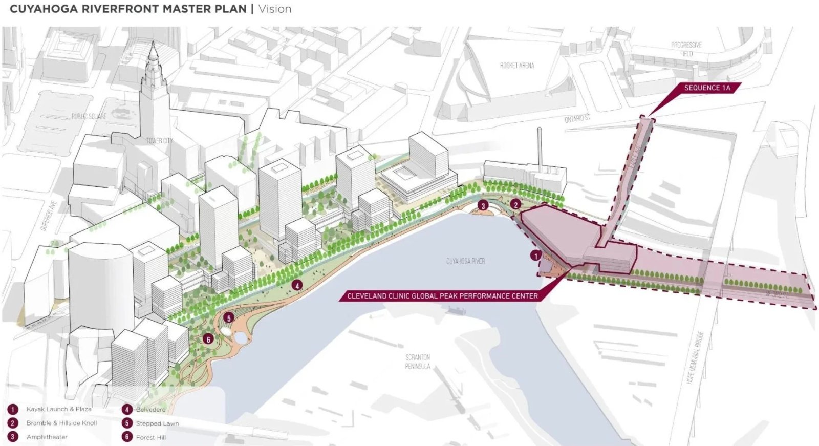 Quy hoạch Tổng thể Bờ sông Cuyahoga xác định vùng đất ven sông là tài sản có thể kết nối cộng đồng, tạo ra không gian công cộng sôi động và nói chung là cải thiện môi trường. Trung tâm Hiệu suất Đỉnh cao Toàn cầu của Phòng khám Cleveland và khu vực công cộng xung quanh sẽ áp dụng những nguyên tắc này và đóng vai trò là chất xúc tác để thúc đẩy khả năng kết nối và tăng trưởng.