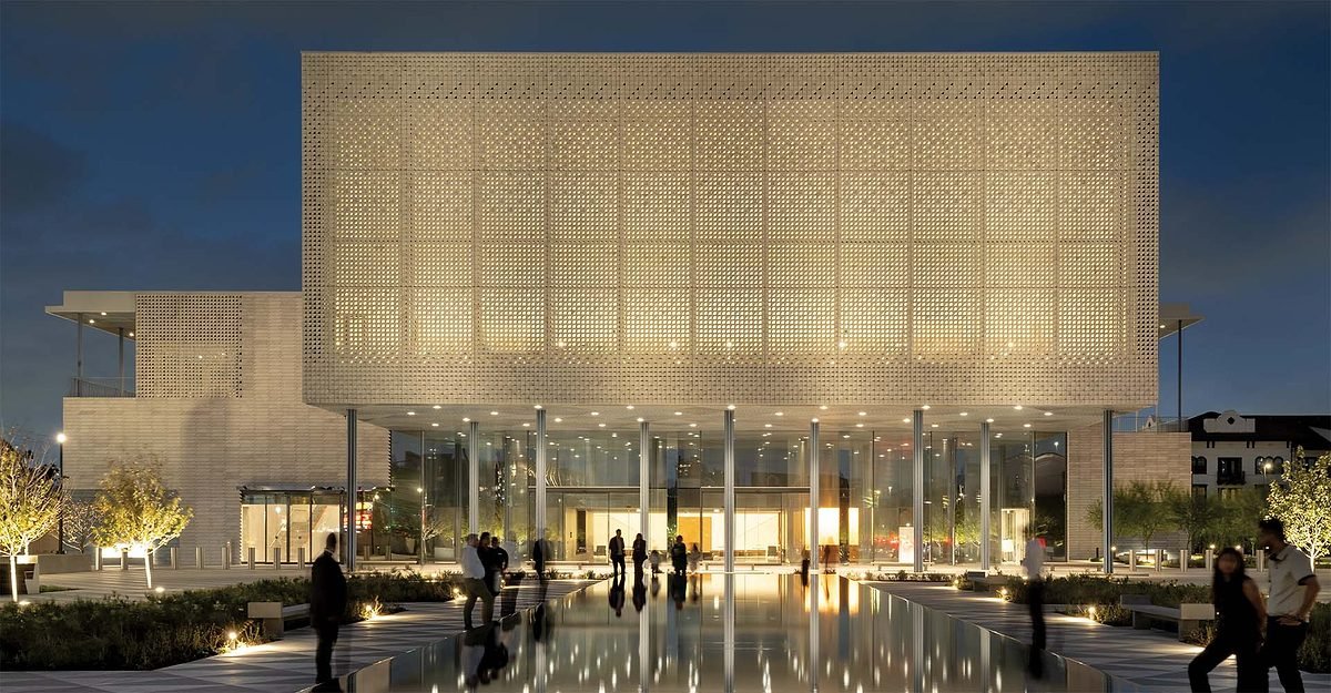 Ngày nay, chu vi của địa điểm được bao quanh bởi một bức tường cao, với khu phức hợp hoành tráng – sự kết hợp của các hình khối có sức nặng được làm mềm bởi các bức tường bình phong – nằm gần chính giữa. Chín mẫu vườn công cộng, được thiết kế bởi kiến ​​trúc sư cảnh quan Nelson Byrd Woltz, xếp tầng ở phía bắc và phía nam. Các bức tường chu vi, sẽ sớm được bao phủ bởi cây sung, vừa giúp giảm thiểu tiếng ồn giao thông dữ dội vừa tỏ lòng tôn kính những khu vườn có tường bao quanh Ba Tư. Cảnh quan bậc thang đối xứng, với các hồ phản chiếu, lối đi dạo rợp bóng cây, đài phun nước và các họa tiết hình học nghiêm ngặt, cũng gợi lên truyền thống Hồi giáo nhưng mang hơi hướng Nam Texas: mỗi bậc thang có một quần xã trồng cây bản địa khác nhau, từ xương rồng mái chèo và cây thùa ở phía trên cùng của địa điểm xuyên qua các thảm cỏ thảo nguyên và cây sồi trong rừng, bước xuống bụi cây bayou. Thomas Woltz, hiệu trưởng cấp cao tại Nelson Byrd Woltz, gọi đây là “đường cắt ngang của Texas”. Sự pha trộn giữa các hình thức truyền thống với đời sống địa phương này không chỉ là một phép ẩn dụ thích hợp cho bản sắc lai của cộng đồng người Ismaili hải ngoại mà còn là một thiết kế chiến lược. Vào năm 2024, Bão Beryl đã đổ lượng mưa gần 12 inch xuống Houston, làm ngập lụt tầng thấp nhất. Cảnh quan mới đã vượt qua thử nghiệm đầu tiên, hấp thụ nước trong vòng vài giờ.