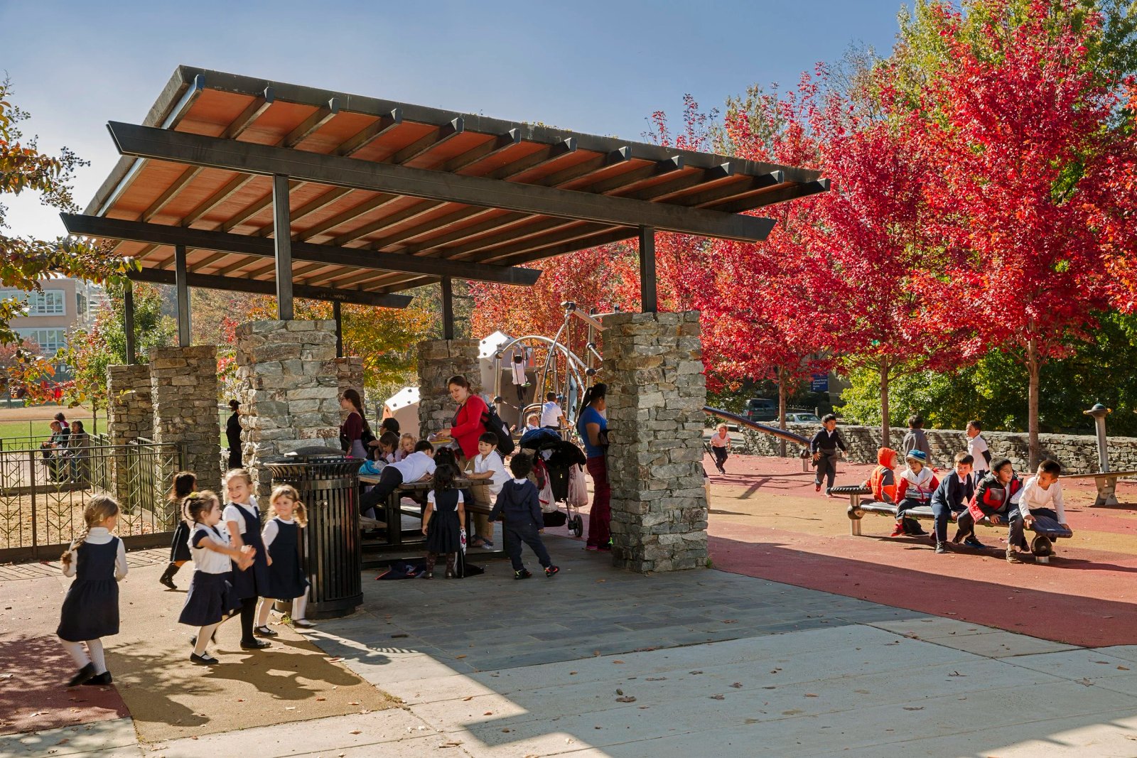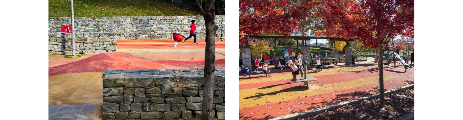 Sự tương tác giữa mặt đất nhấp nhô và những bức tường đá có trật tự hơn làm sinh động không gian và tạo cơ hội cho những trò chơi ngẫu hứng, thân mật. Được ốp bằng đá trường Carderock của địa phương, các bức tường cũng đóng vai trò như những yếu tố chỗ ngồi tinh tế, cung cấp địa điểm cho cha mẹ và người chăm sóc ngồi và giao lưu trong khi trẻ em chơi gần đó. Những hàng cây phong xác định rõ hơn và trình bày rõ hơn bố cục tuyến tính, đồng thời cung cấp bóng mát rất cần thiết trong những tháng hè.