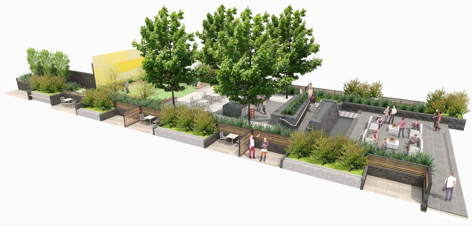 các đơn vị ở cấp độ sân. Khu vực sân hiên đầu tiên có lối vào trực tiếp từ không gian tiện nghi bên trong và phục vụ như một sảnh khách ngoài trời với nội thất rộng rãi, hố lửa điêu khắc và đài phun nước thẳng đứng đặc biệt vang vọng nhẹ nhàng khắp sân. Đài phun nước đổ xuống một hồ bơi nhỏ, nơi người dùng có thể làm mát đôi chân của mình vào những buổi chiều mùa hè ấm áp và cũng có tác dụng che chắn một đoạn đường nối ADA cung cấp lối đi tới các khu vực sân thượng phía trên. Khu sân thượng thứ hai, được hình thành như một khu rừng ăn uống, được tổ chức xung quanh một bàn ăn và nướng bằng đá granit hoành tráng nhằm tôn vinh di sản ẩm thực của Union Market đồng thời chứa các nhóm có quy mô khác nhau. Trục tổ chức trung tâm của sân kết thúc ở khu vực sân thượng thứ ba, nơi có một bức tranh tường lớn chủ trì một khu vực tụ tập thân mật với bãi cỏ tổng hợp dưới chân và được bao quanh bởi một chiếc ghế gỗ điêu khắc.