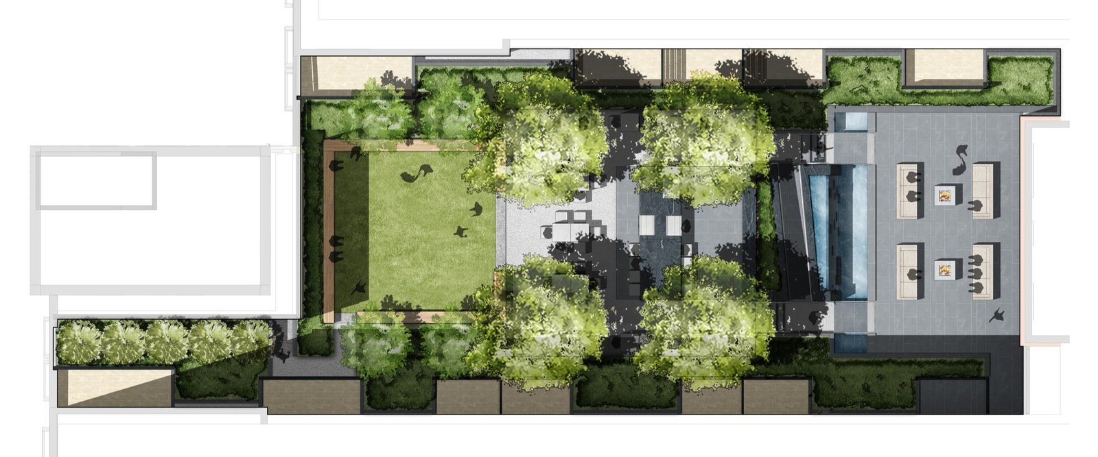 Tổ chức không gian của sân thượng rất đơn giản, cổ điển và hiệu quả: một loạt ba khu vực đa dạng về mặt không gian và khác biệt về mặt lập trình được sắp xếp dọc theo một trục trung tâm. Các điều kiện ngưỡng khác nhau thể hiện mối quan hệ cụ thể giữa các không gian và cho phép chúng được sử dụng riêng lẻ hoặc phối hợp. Để đáp ứng các yêu cầu về nước mưa của địa phương, nhóm thiết kế đã nghĩ ra một loạt hệ thống xử lý và giữ nước mưa tích hợp để thu nước mưa chảy tràn từ mái tòa nhà. Nằm ở rìa sân, những người trồng cây cũng bố trí một loạt sân hiên có lối đi dành cho từng cá nhân ở.