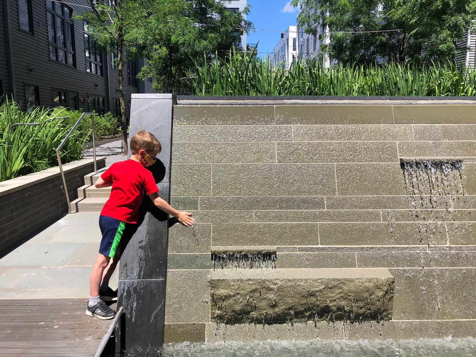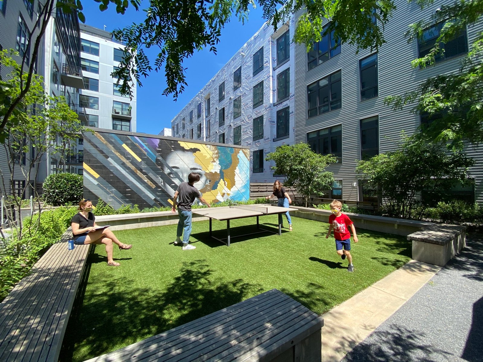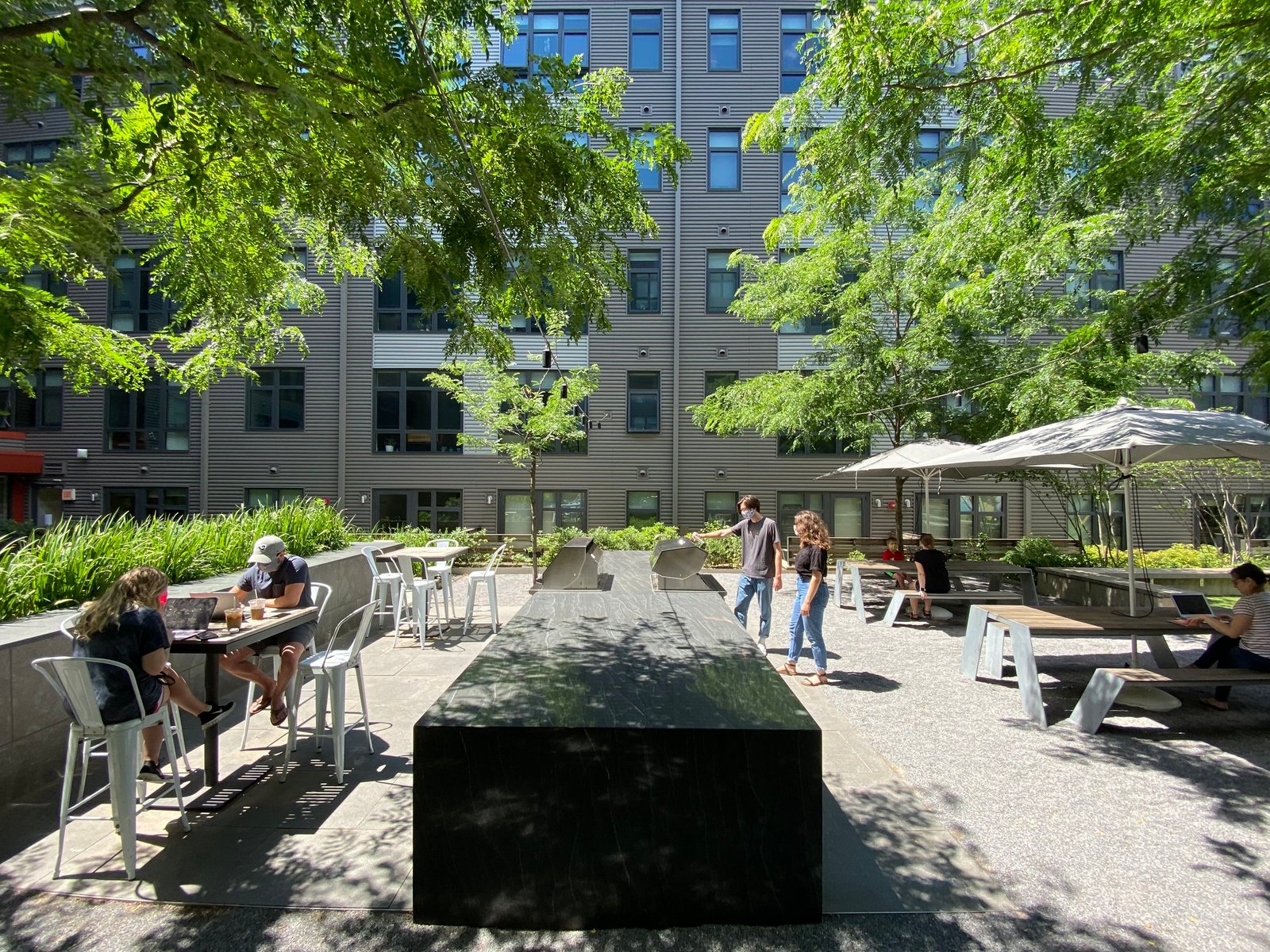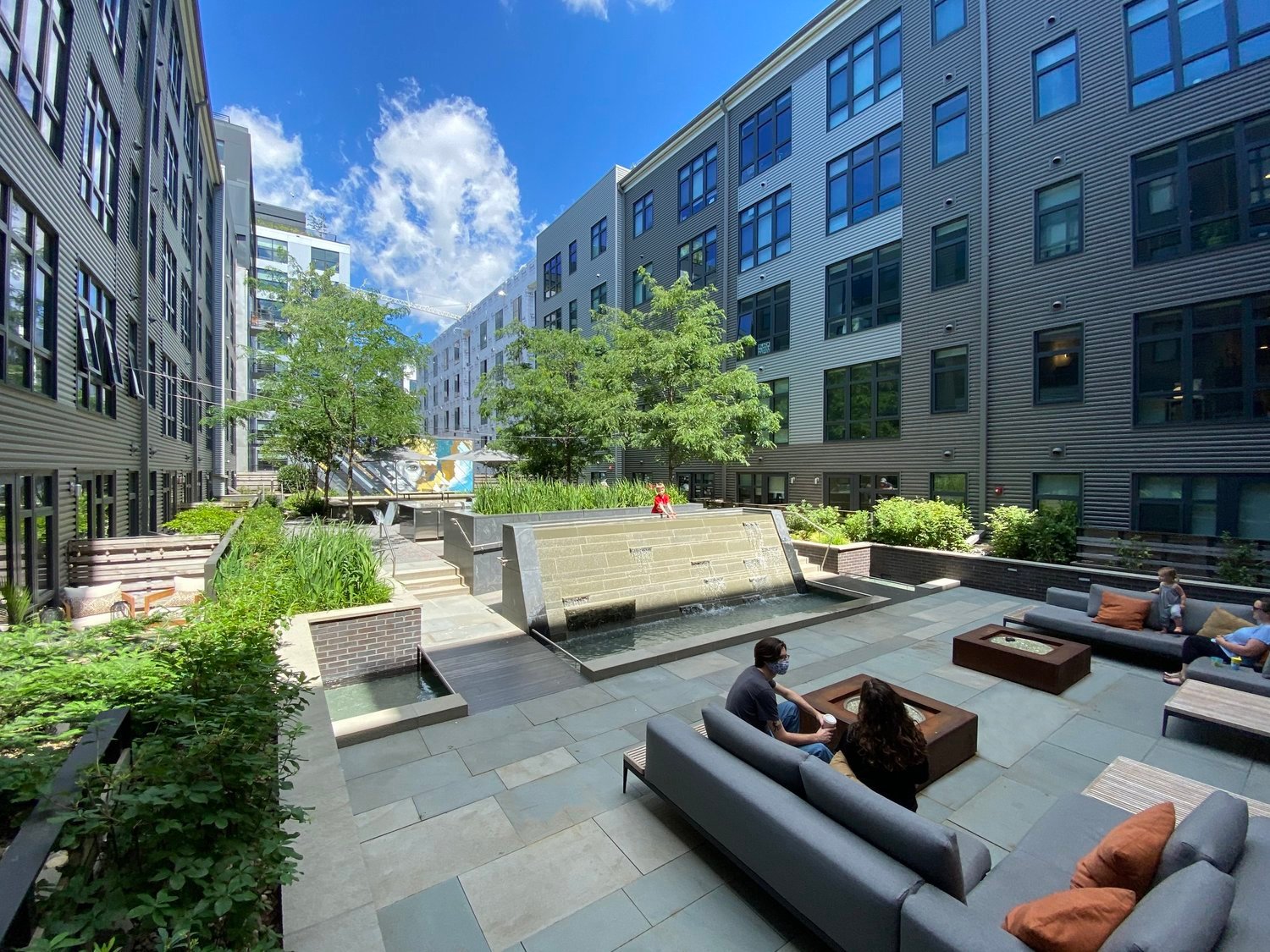các đơn vị ở cấp độ sân. Khu vực sân hiên đầu tiên có lối vào trực tiếp từ không gian tiện nghi bên trong và phục vụ như một sảnh khách ngoài trời với nội thất rộng rãi, hố lửa điêu khắc và đài phun nước thẳng đứng đặc biệt vang vọng nhẹ nhàng khắp sân. Đài phun nước đổ xuống một hồ bơi nhỏ, nơi người dùng có thể làm mát đôi chân của mình vào những buổi chiều mùa hè ấm áp và cũng có tác dụng che chắn một đoạn đường nối ADA cung cấp lối đi tới các khu vực sân thượng phía trên. Khu sân thượng thứ hai, được hình thành như một khu rừng ăn uống, được tổ chức xung quanh một bàn ăn và nướng bằng đá granit hoành tráng nhằm tôn vinh di sản ẩm thực của Union Market đồng thời chứa các nhóm có quy mô khác nhau. Trục tổ chức trung tâm của sân kết thúc ở khu vực sân thượng thứ ba, nơi có một bức tranh tường lớn chủ trì một khu vực tụ tập thân mật với bãi cỏ tổng hợp dưới chân và được bao quanh bởi một chiếc ghế gỗ điêu khắc.