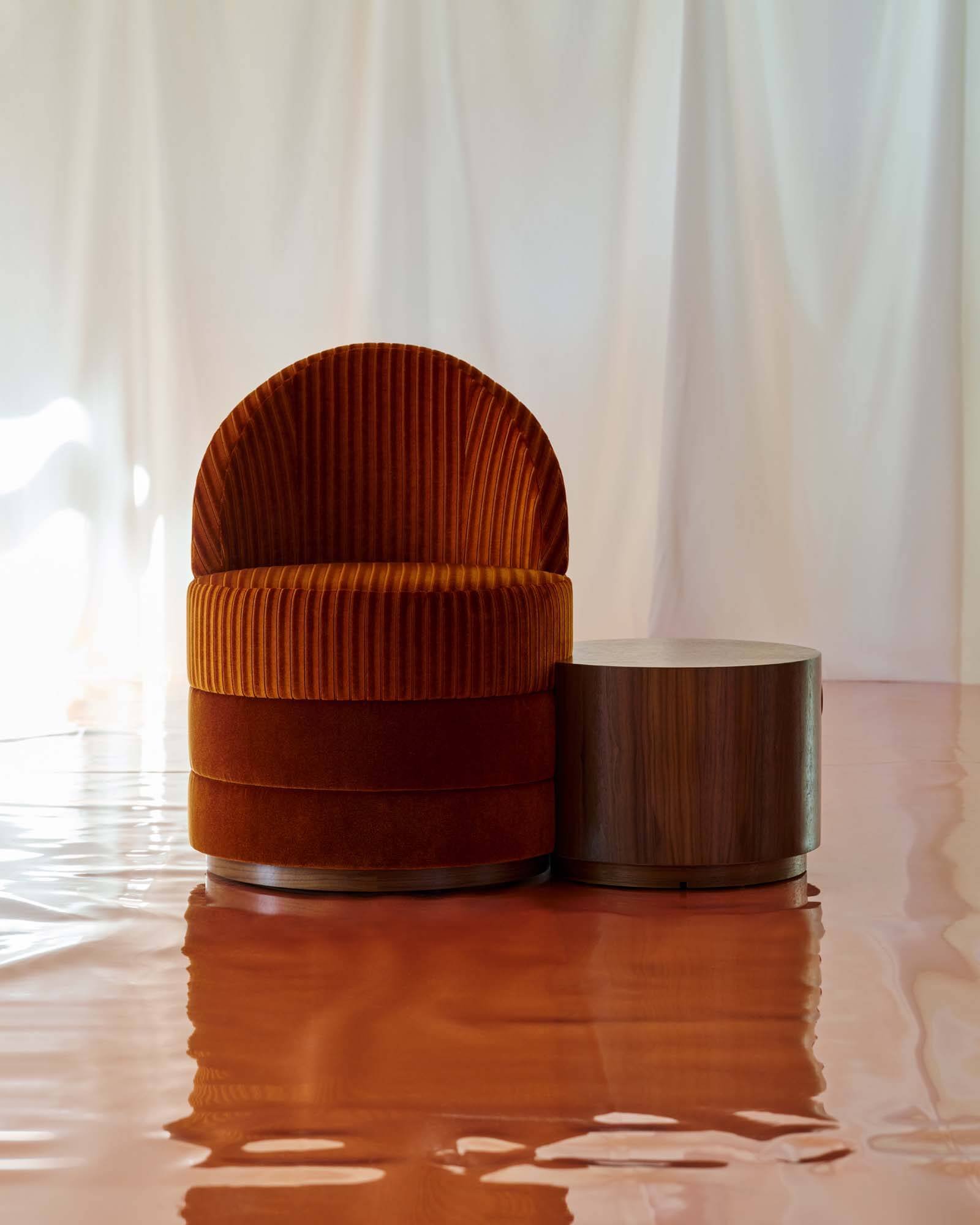 Khung gỗ óc chó của Topanga, được điều chỉnh bằng các chốt xoay, tạo nền tảng nhịp nhàng cho chiếc đệm dày trên chiếc ghế tựa thủ công này.