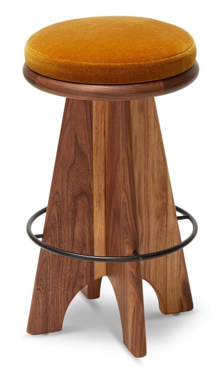 Ghế đẩu có cảm giác ấm cúng hơn với chân đế bằng gỗ điêu khắc này, được bao quanh bởi một chỗ để chân bằng kim loại và trên cùng là một chiếc ghế xoay sang trọng.