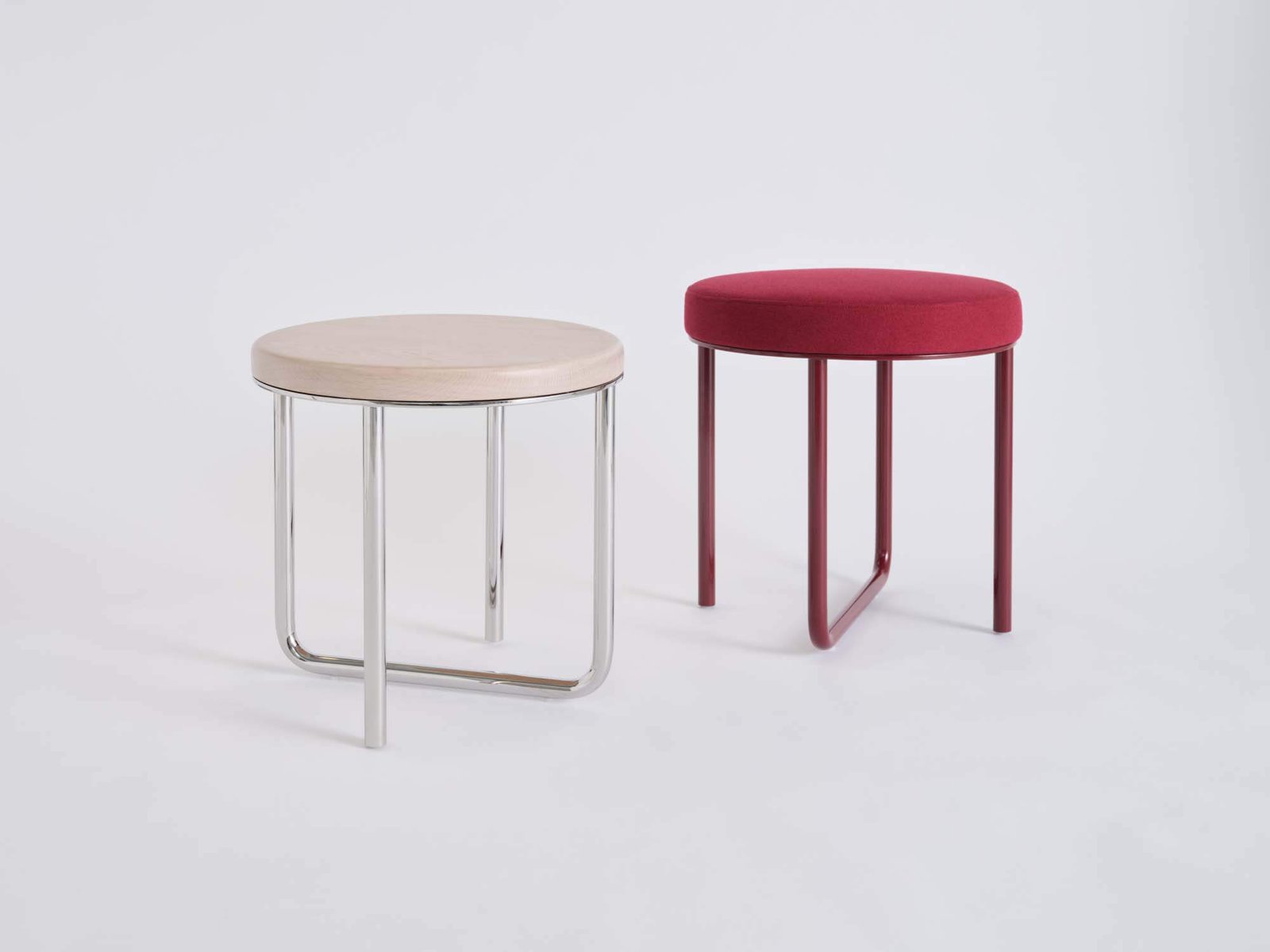 Chân đế bằng thép không gỉ có chân hình chữ U, tạo ra sự tương phản nổi bật với lớp đệm bọc sang trọng trên độ cao tinh tế của chiếc ghế đẩu khiêm tốn này.
