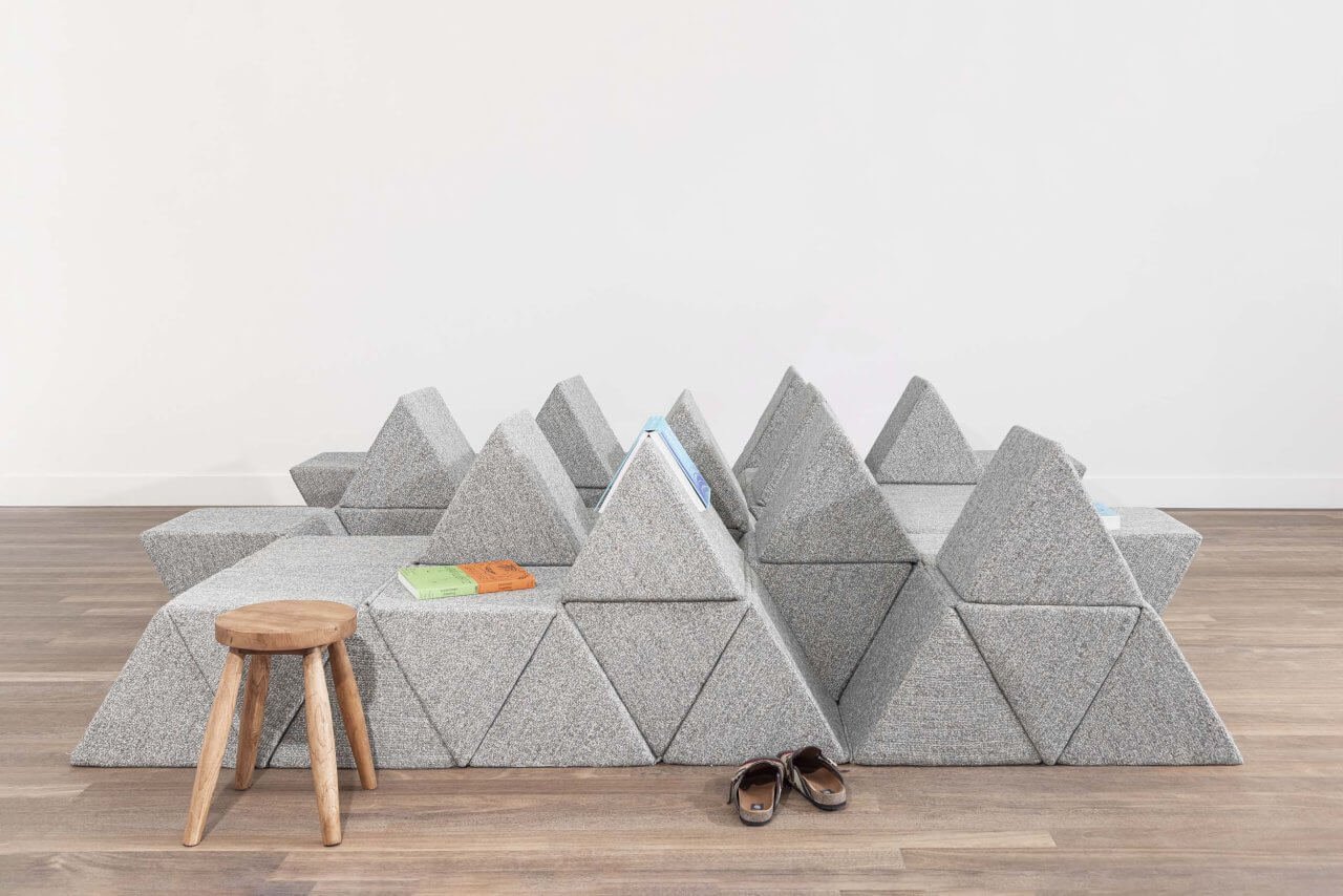 Sofa Peaks của Yves Béhar là một chiếc ghế sofa mô-đun bao gồm các hình tam giác xốp kép có thể lật lên hoặc quay xuống và được kết nối bằng bản lề ẩn và khóa kéo vô hình.