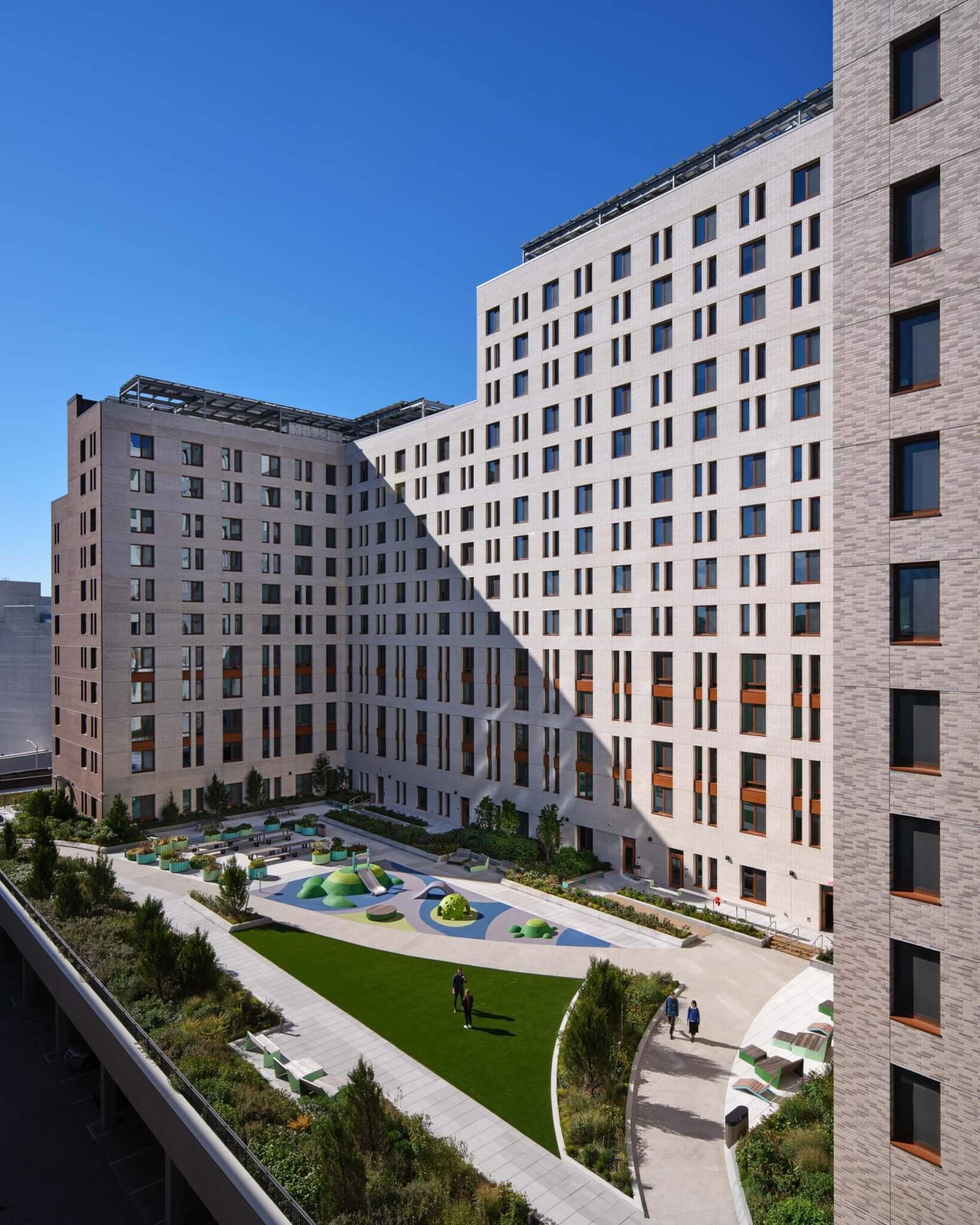 Như được giải thích tại chỗ bởi đối tác của Dattner, Daniel Heuberger, điều này C hình dạng được lặp lại trong sáu giai đoạn của dự án. Gena Wirth, hiệu trưởng thiết kế và đối tác của SCAPE, cho biết: Trong khi các tòa nhà cao hơn bên ngoài khác nhau nhiều hơn về kiến trúc, thì những tòa nhà ngắn hơn bên trong tạo ra một phần ứng nhất quán bao quanh sáu mẫu không gian mở, được thiết kế để trải rộng từ cảnh trồng dày đặc đến cảnh nông nghiệp cởi mở hơn, Gena Wirth, hiệu trưởng thiết kế và đối tác của SCAPE, cho biết MỘT.