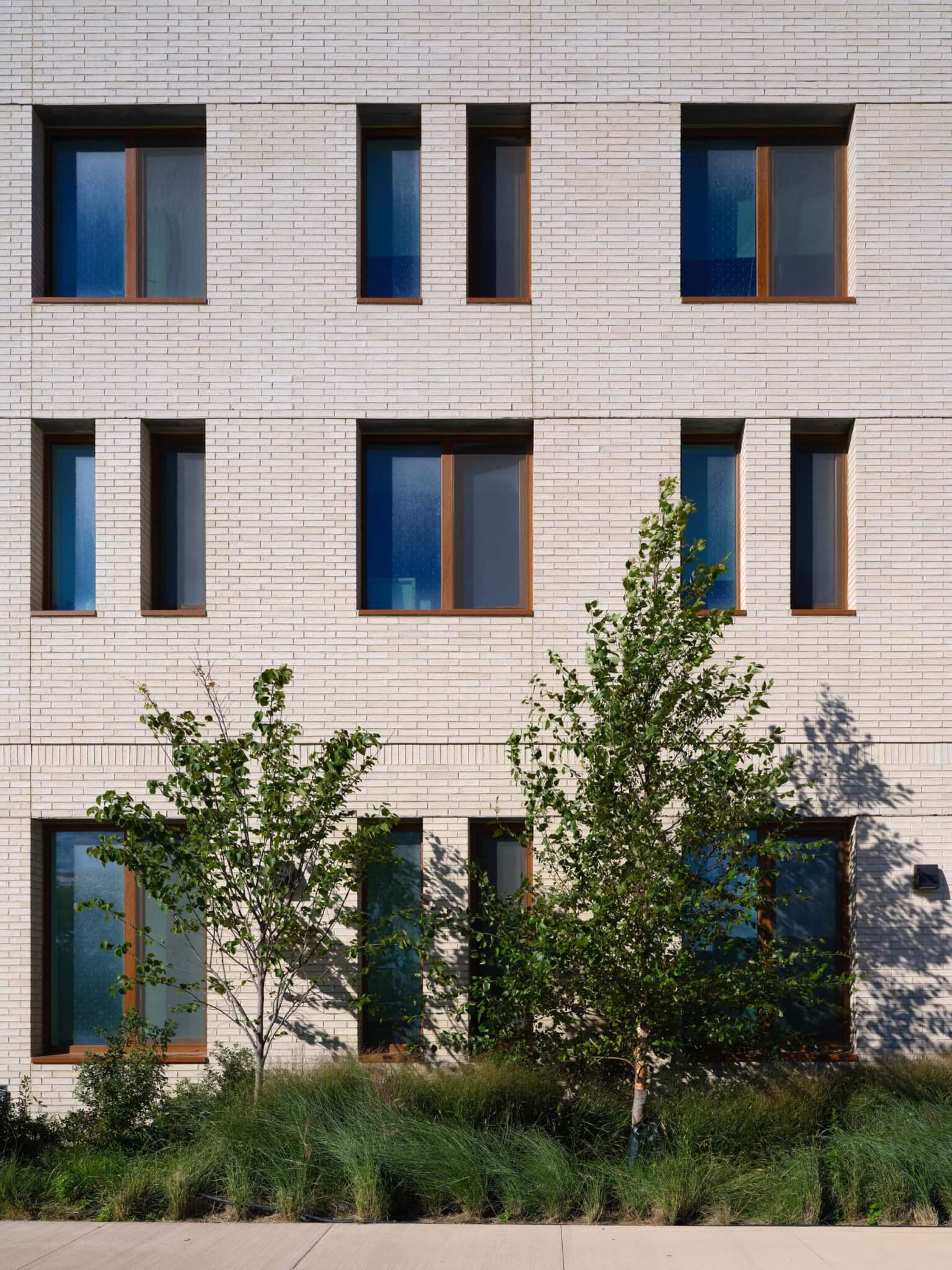 Mặt tiền bên ngoài của các tòa nhà được ốp bằng hỗn hợp gạch có thể thay đổi, trong khi mặt tiền bên trong được lót bằng gạch đặc màu kem. Các mẫu cửa sổ khác nhau giữa một lỗ mở đục lỗ duy nhất và hai khẩu độ dọc riêng biệt. Các cửa sổ hướng ra sân được ghép lại với nhau thành các dải 2 tầng, giúp củng cố sân hiên như một không gian chung.