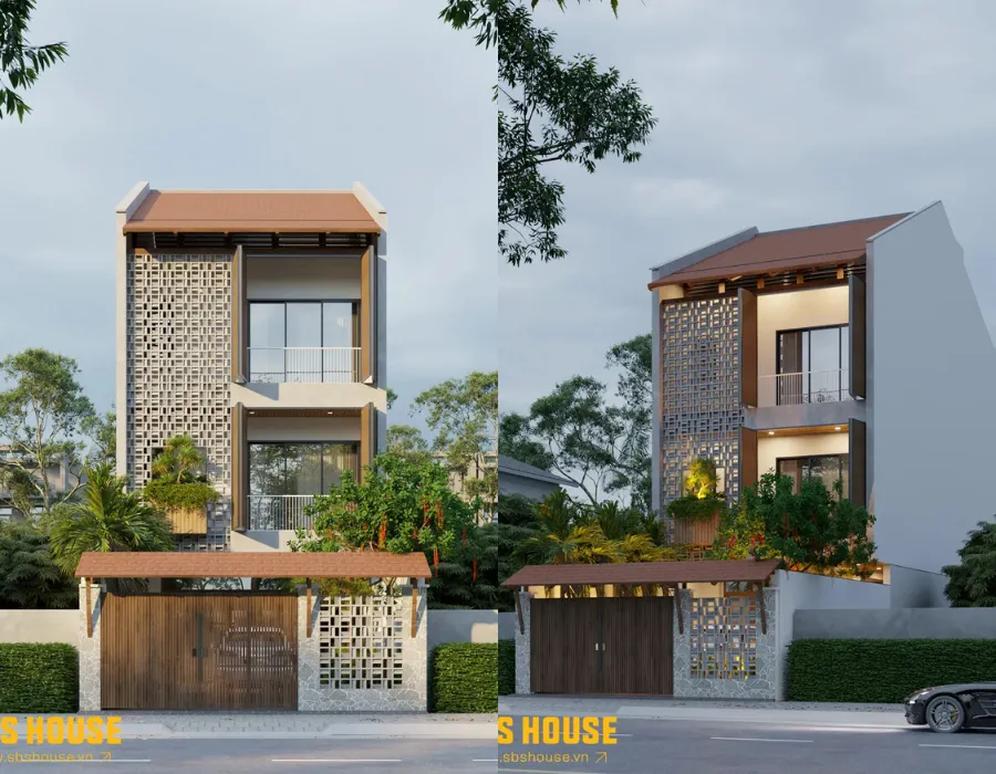 Một trong những điểm nổi bật của H’s House là cách các kiến trúc sư đã đồng bộ nhiều lớp giải pháp ở mặt tiền để giải quyết triệt để vấn đề nắng gắt buổi chiều. Tường gạch bông gió vừa đóng vai trò che chắn vừa tạo lỗ thông gió tự nhiên. Bên cạnh đó, ban công được đẩy lùi sâu tạo một khoảng đệm mát, giúp giảm lượng bức xạ nhiệt trực tiếp vào bên trong.