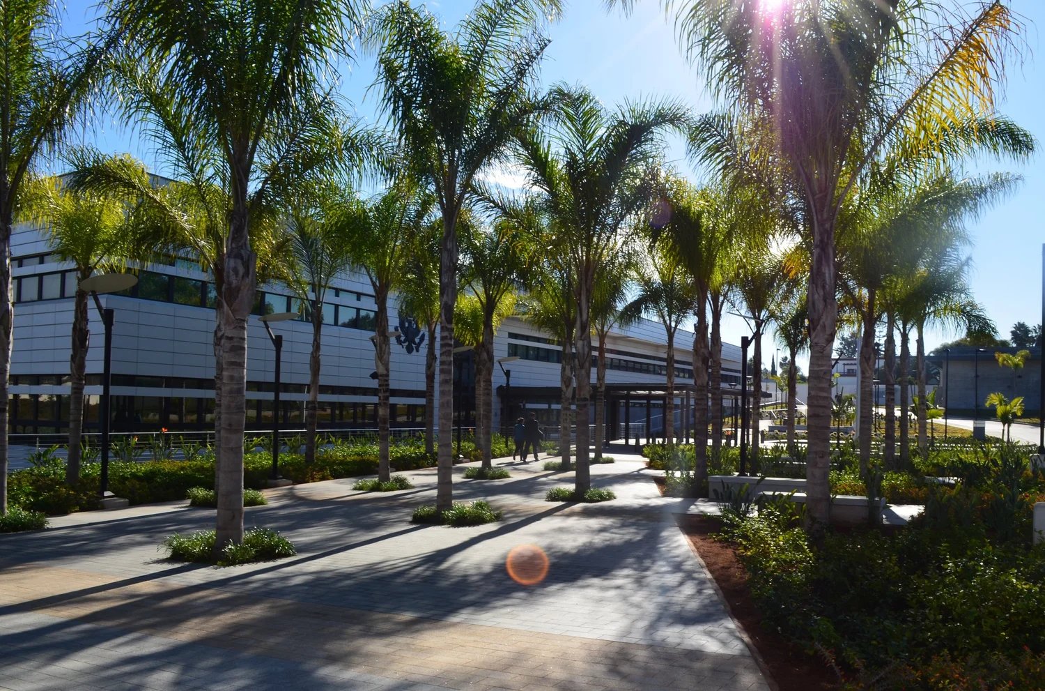 Một giải pháp thiết kế là tạo ra một lối vào có bóng râm và một sân trong hay còn gọi là “riad” rộng mở và hấp dẫn tràn ngập âm thanh của nước và mùi của một khu vườn tươi tốt được chia sẻ bởi tất cả nhân viên đại sứ quán. Một khu vườn đất ngập nước làm tăng thêm nét tươi tốt của