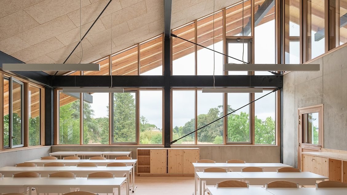 Bên cạnh đó, ánh sáng ban ngày tràn ngập khắp nơi, không chỉ trong lớp học mà còn ở cầu thang, hành lang. Đủ rộng để chứa các hoạt động giáo dục tự phát, sau này vươn lên tầng áp mái ở cả hai école maternelle (nơi có giếng trời đảm bảo độ sáng tối đa) và tầng trên cùng của école élémentaire. Để duy trì sự trong sạch của các khối bên trong, hệ thống ống dẫn được cách nhiệt trong các phần kín của tầng áp mái, trong khi các tấm trần bằng sợi gỗ giúp giảm tiếng ồn. Một lần nữa, vì lý do âm thanh, các bức tường chịu lực ngăn cách các phòng học đều bằng bê tông, bên trong được để nguyên ngoại trừ lớp sơn tường bằng gỗ thông (người ta chỉ có thể tiếc nuối về sự bất cẩn của nhà thầu trong quá trình đúc). Đối với sàn nhà, các kiến trúc sư đã chỉ định vải sơn tông màu ấm cho hành lang và ván thông cho các lớp học.