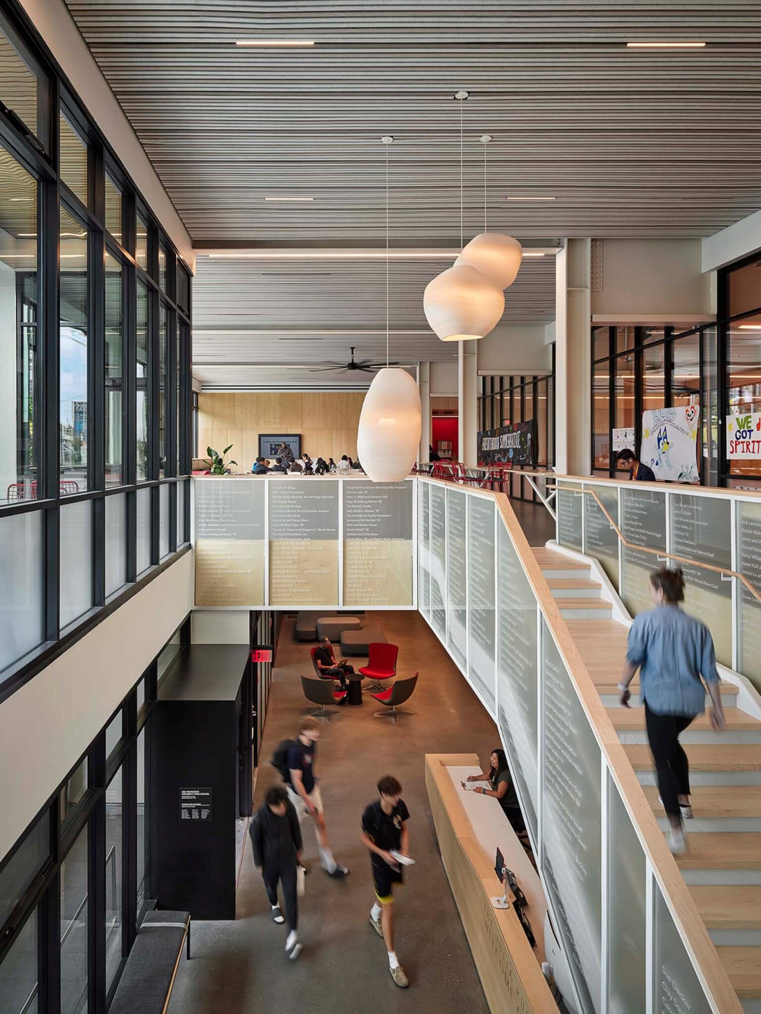 Sự sẵn có và cơ hội về ánh sáng là ưu tiên hàng đầu của trường học. Khi bước vào sảnh chính và tầng trệt, học sinh ngay lập tức được dẫn lên khu vực chung ở tầng trên với cửa sổ kính suốt từ trần đến sàn.