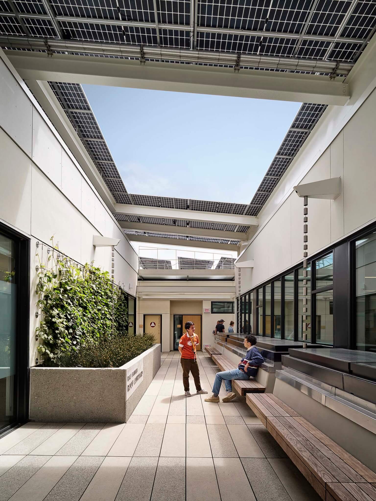Các tấm pin mặt trời che phủ phần trên cùng của tòa nhà. Các tấm trải dài trên lối đi trên mái nhà để tạo bóng mát cho học sinh. (Matthew Millman)