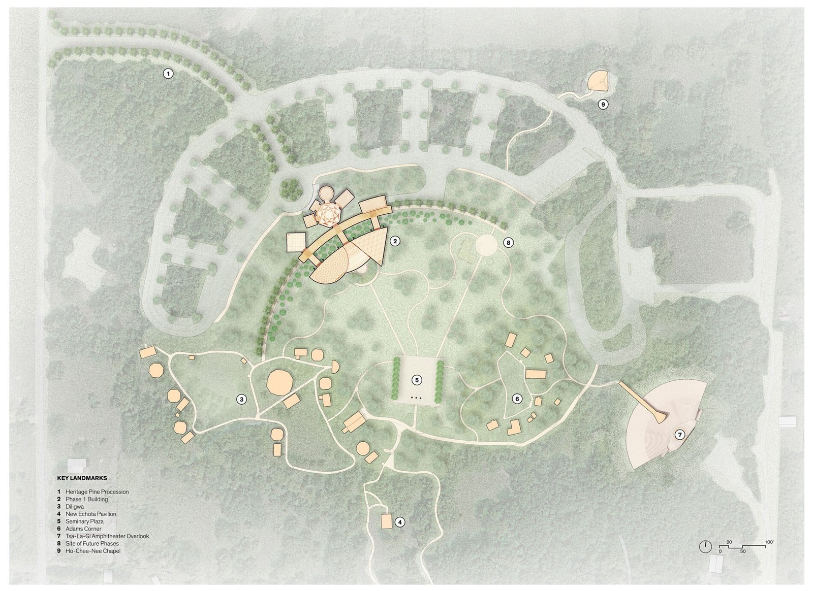 Moshe Safdie cho biết: “Các gian hàng được bố trí phù hợp với vùng đất, các công trình kiến trúc được đặt trong khung cảnh rừng cây và câu chuyện về Quốc gia Cherokee được lồng ghép xuyên suốt—tạo ra một khung cảnh thúc đẩy sự kết nối, thuộc về và tính liên tục giữa người Cherokee, lịch sử và vùng đất của họ.”