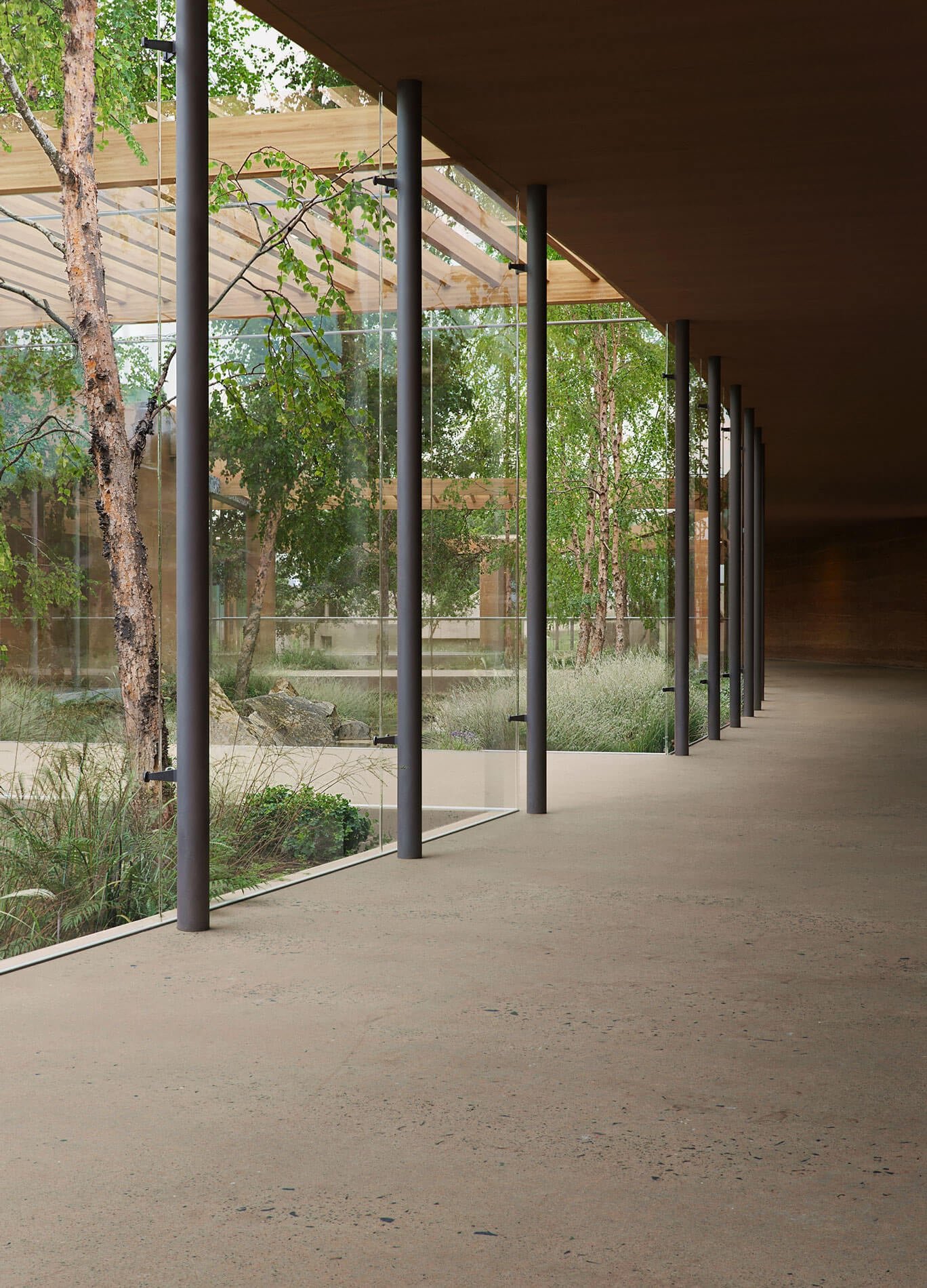 Phòng trưng bày kèm theo sẽ quấn quanh đường thủy. Những không gian này với kính từ sàn đến trần được xem như những lối đi có mái che vẫy gọi từ bên ngoài vào.