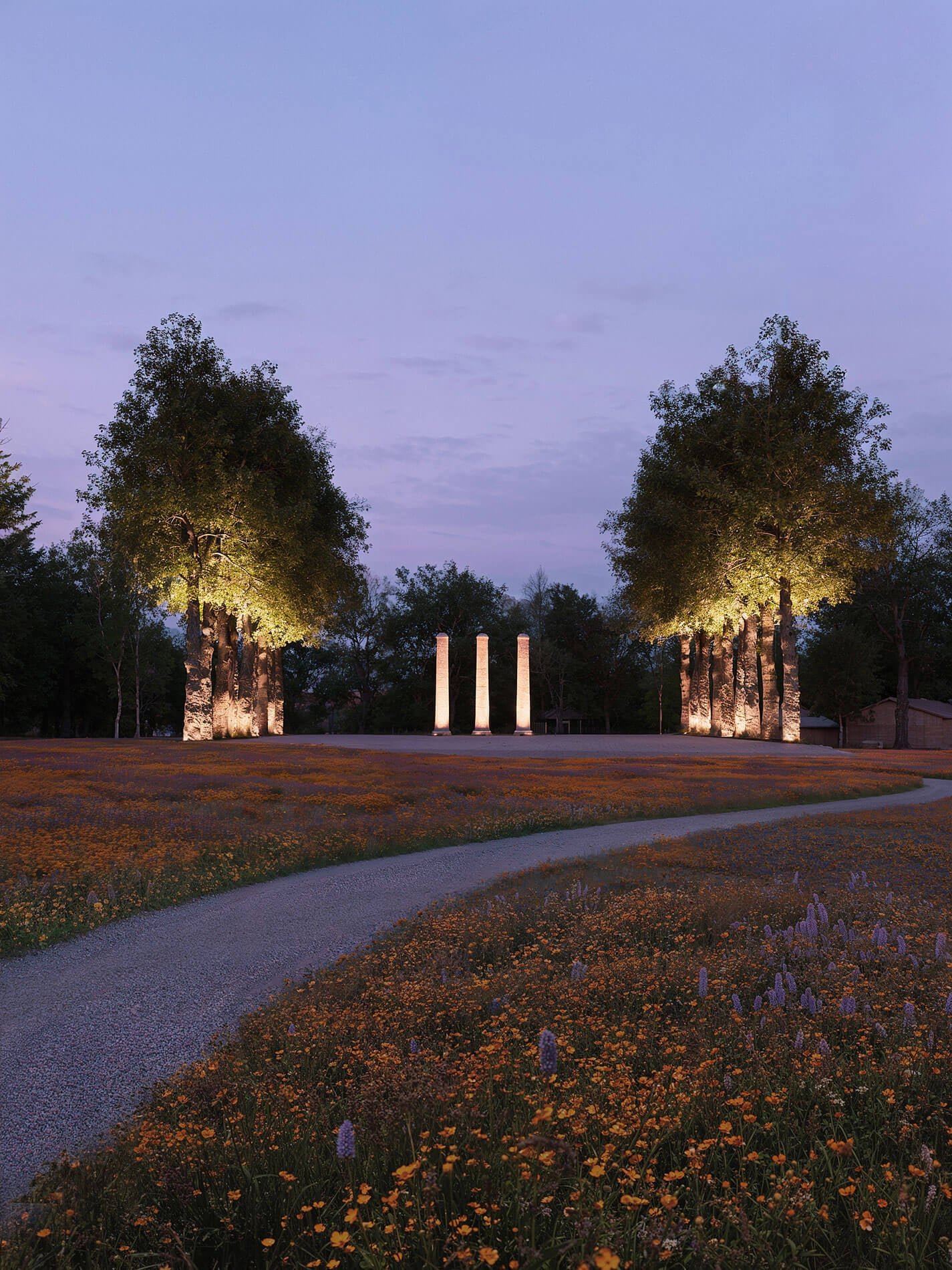 Các cột sẽ được đặt ở vị trí trung tâm trên một quảng trường lát đá. Cây cối sẽ xếp dọc hai bên quảng trường, với những thân cây phản chiếu đường thẳng của các cột.