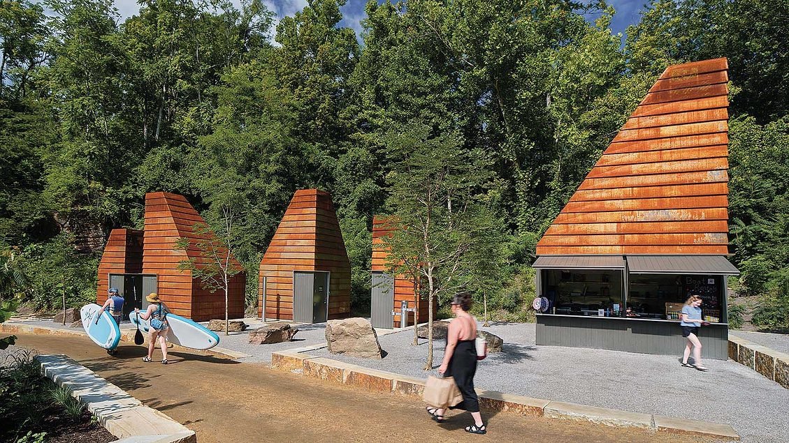 Các gian hàng hòa vào khu rừng. Chúng được thông gió thụ động và cung cấp những tiện nghi rất cần thiết cho người sử dụng công viên. Ảnh © Keith Isaacs