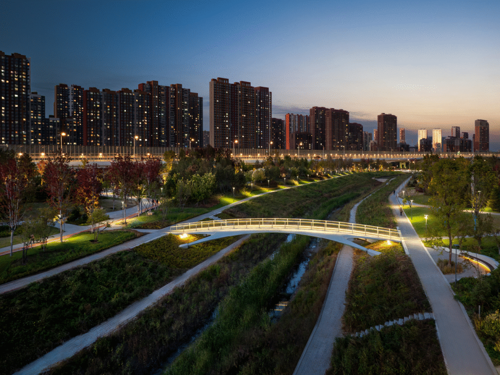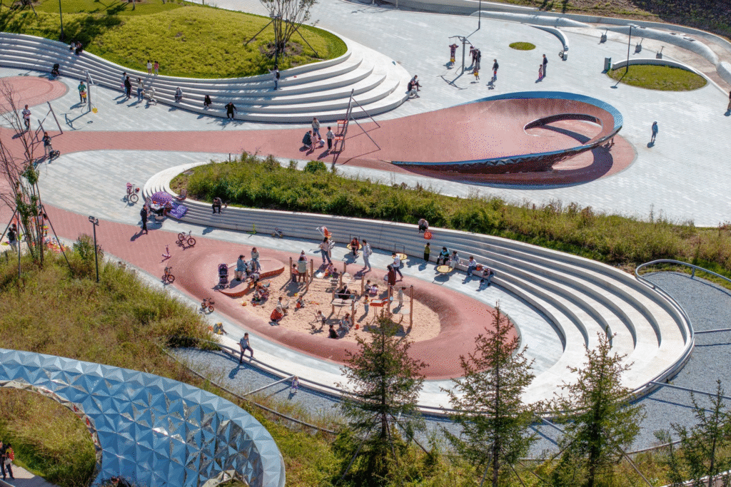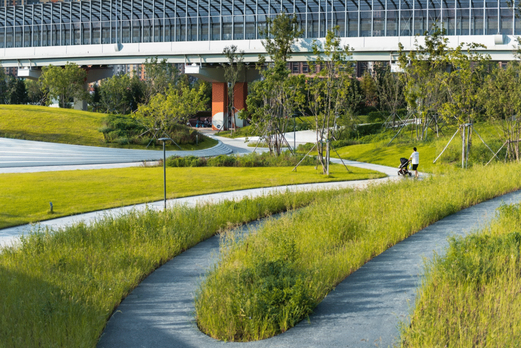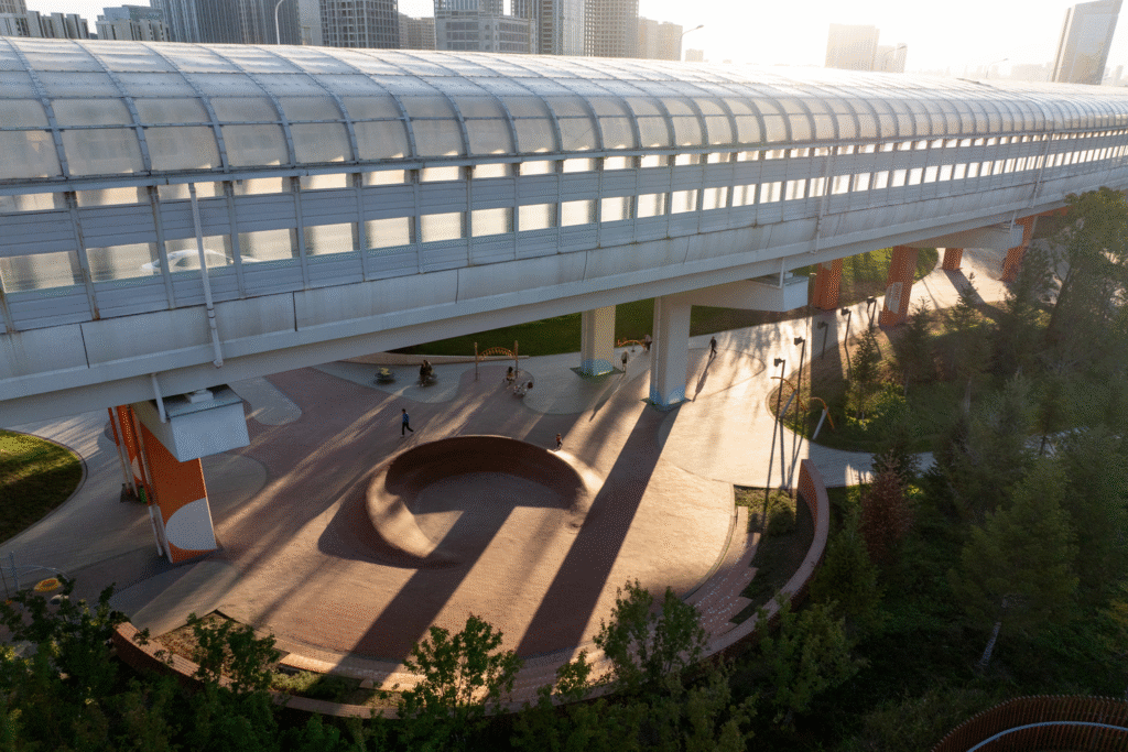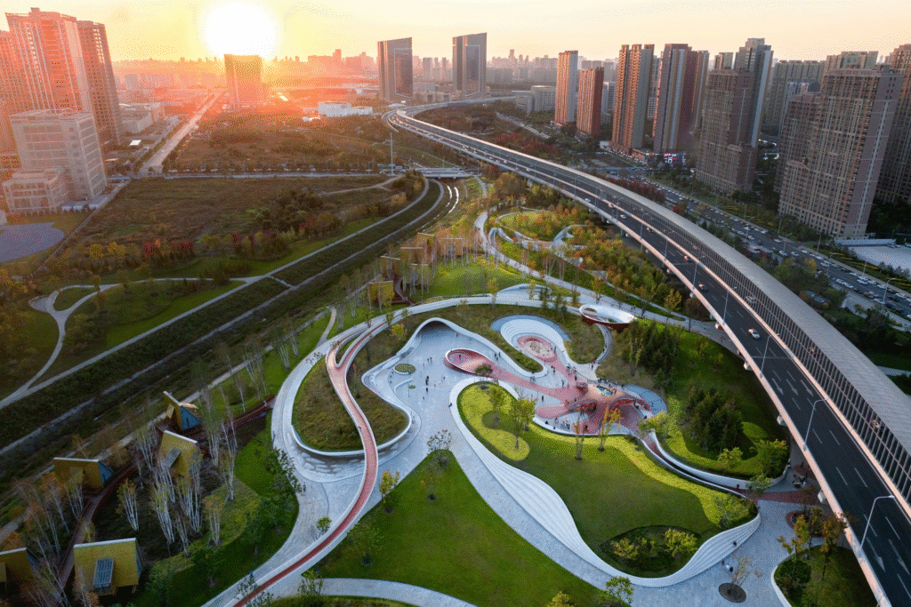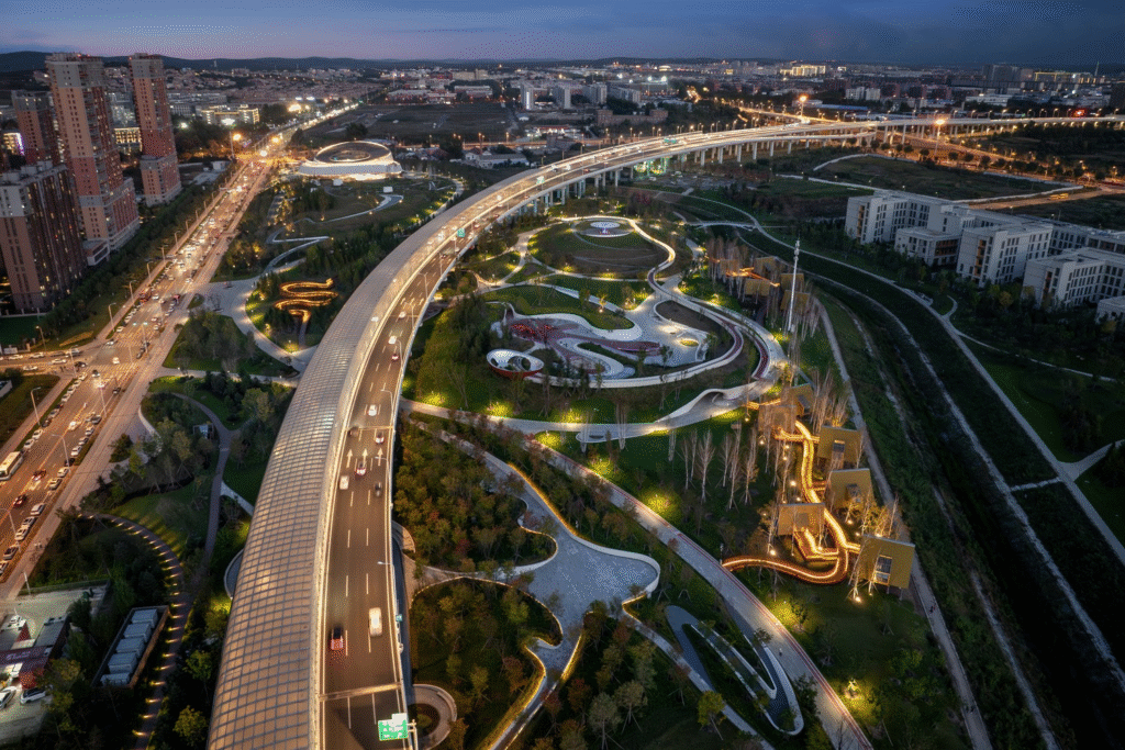 Jingyue Central Park tọa lạc tại Khu Công nghệ cao Jingyue, thành phố Trường Xuân, với tổng diện tích 490.000 m2, trong đó 59.000 m2 là khu vực xây dựng. Được xem như “lá phổi xanh sinh thái” của khu vực, công viên này kết nối cư dân với thiên nhiên thông qua việc thiết kế các không gian xanh, hồ nước, khu vui chơi và không gian đa năng dưới cầu vượt. Trước khi được cải tạo, địa điểm này từng là đất bỏ hoang với rác thải xây dựng, làm gián đoạn kết nối giữa các khu vực xung quanh. Công trình không chỉ hồi sinh vùng đất này mà còn trở thành điểm nút quan trọng trong hệ thống không gian xanh đô thị, phục vụ hơn 300.000 cư dân, các trường học, doanh nghiệp, và trường đại học lân cận.