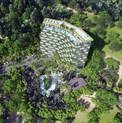 Khi đội ngũ ALPES lần đầu tiếp cận khu đất, công trình đã được xây dựng phần thô đến tầng thứ 6, với hình khối khá đơn điệu và đại trà như bao hình ảnh khách sạn khác. Nhận thấy vị trí đắc địa của công trình, với việc tựa lưng vào núi và tầm nhìn hướng ra biển, đội ngũ thiết kế đã quyết định mang lại cho M Hotel Phú Quốc những đường nét kiến trúc nổi trội, nhưng không kém phần mềm mại cần có để hòa quyện với thiên nhiên xung quanh.