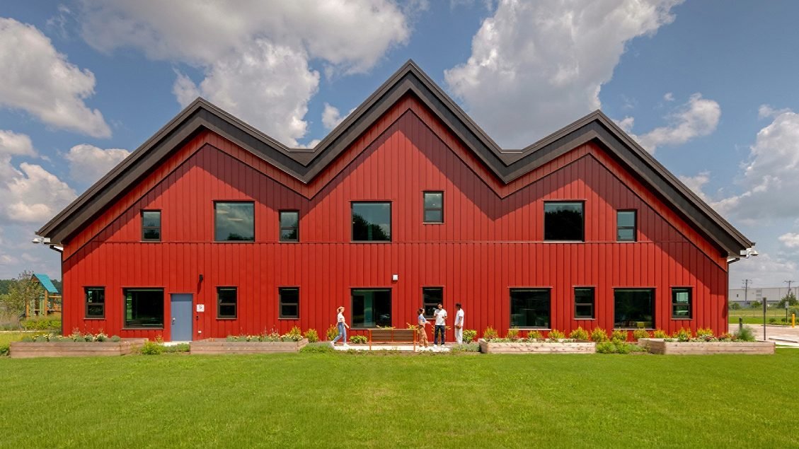 Nhìn từ bên ngoài, hình thức tòa nhà bắt chước đầu hồi của những ngôi nhà một tầng rưỡi tạo nên khu phố Davee Gardens của Richmond. Bảng màu vật liệu—bao gồm các tấm kim loại màu đỏ, gạch màu nâu vàng và kính Low-E—cân bằng độ bền với khả năng giảm chi phí. Ví dụ, mái nhà được thiết kế giống với mái kim loại có đường may đứng. Tuy nhiên, để đáp ứng ngân sách khắt khe, nhóm thiết kế đã chỉ định loại màng một lớp có giá cả phải chăng hơn với các gân dọc được gắn vào.