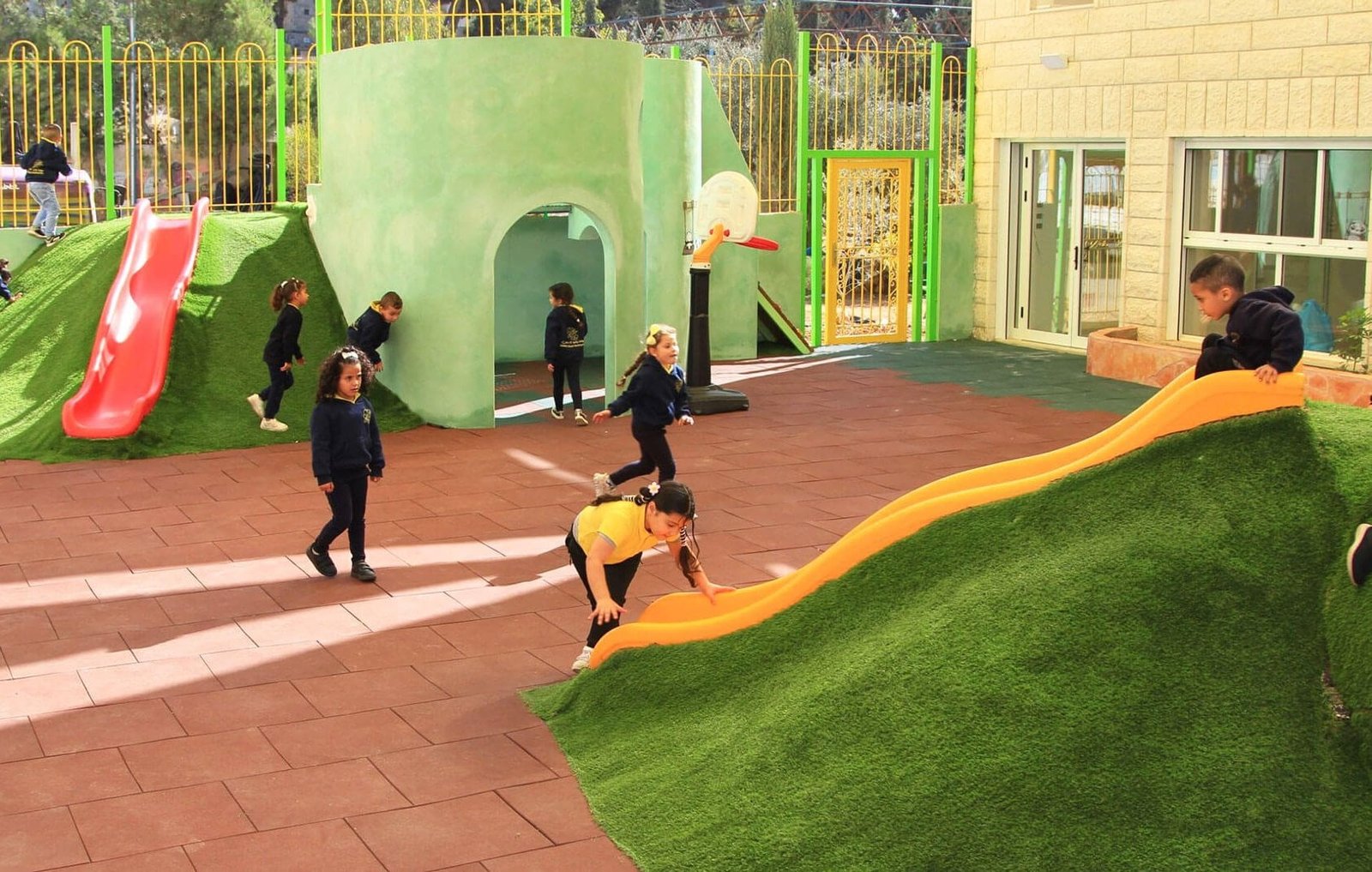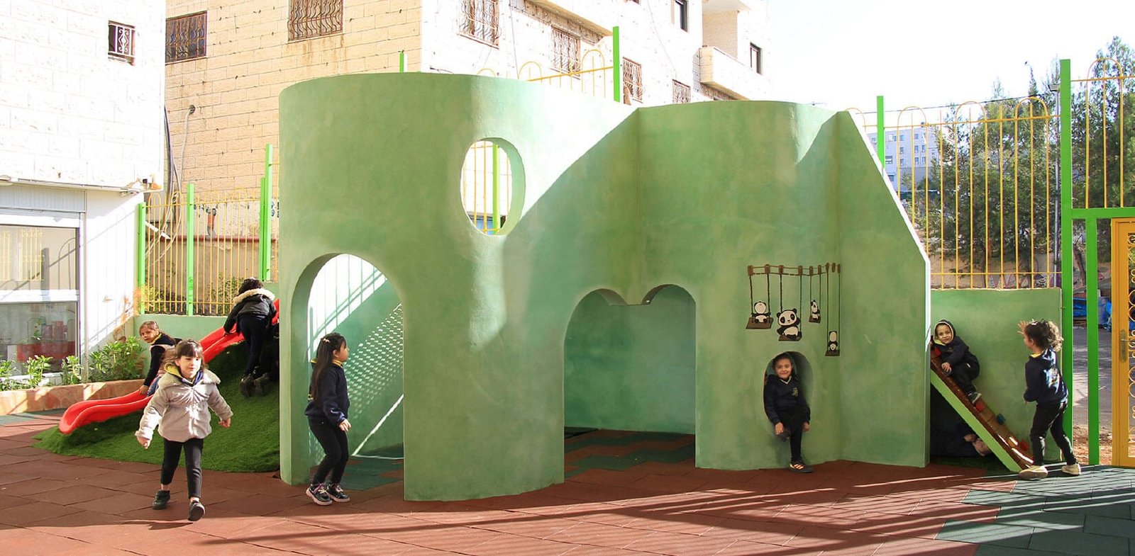Các bậc phụ huynh gửi con đến Trường mẫu giáo Zahrat Al-Yasmeen vào sáng sớm, sau đó học sinh hối hả đến sân chơi để bắt đầu ngày mới. Gạch cao su làm cho bề mặt dễ bị va đập và bầm tím. Một chi tiết điêu khắc, bê tông mà trẻ em có thể leo trèo được sơn màu xanh bột, điểm thêm một bức tranh về những chú gấu panda.