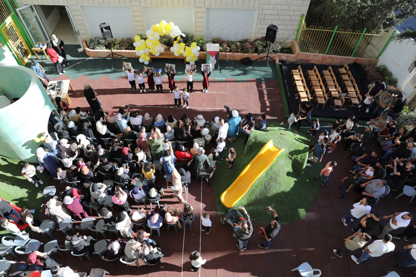 Cô tiếp tục: “Nó có thiết bị sân chơi và đồ chơi điển hình, những thứ có trong các công viên xung quanh Palestine, nhưng cũng có thiết kế mới, sáng tạo tích hợp hoạt động chơi sáng tạo. Nó được giáo viên và toàn thể cộng đồng sử dụng.” “Đối với các sự kiện, chúng tôi bố trí ghế, sân khấu. Chúng tôi đã tổ chức lễ tốt nghiệp mẫu giáo ở đó. Vì vậy, nó không chỉ là một sân chơi. Đó là một trung tâm cộng đồng, nơi mọi người có thể tụ tập và giao lưu.”