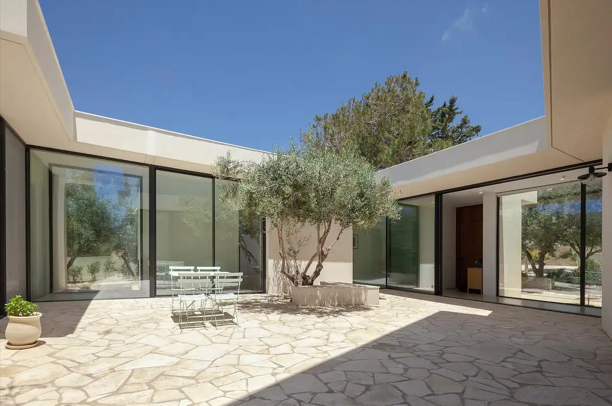 Tất cả các khối nhà và không gian nội thất đều mở ra sân trong, nơi kết nối tất cả các không gian này một cách thực tế và trực quan. Đồng thời, các lỗ mở được bố trí một cách chiến lược để lộ ra những cây ô liu, sau đó có thể nhìn thấy từ bên trong ngôi nhà cũng như từ sân trong, giúp không gian sau có cảm giác cởi mở hơn và kết nối với môi trường bên ngoài ngôi nhà.