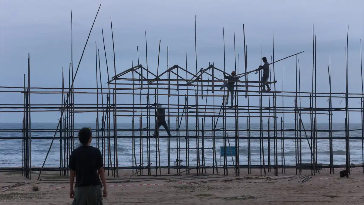 Chúng tôi đã trích xuất các đặc điểm cốt lõi của những túp lều lấn chiếm (cấu trúc nhà sàn thích ứng với ranh giới đất-nước, khung trong suốt và mở, và hình thức định cư được lắp ráp hữu cơ) và giàn nhiều lớp (sản phẩm công nghiệp hiện đại) với khung tre (vật liệu bản địa). Các giàn lớp đóng vai trò là cấu trúc chính, có thể đối phó với thời tiết bão thay đổi ở bờ biển vào tháng 8 và tạo điều kiện cho việc xây dựng, tháo gỡ, lắp ráp lại và mở rộng nhanh chóng. Các khung tre được hoàn thiện với sự hợp tác của nhóm làng và sau sự kiện, tất cả nguyên liệu tre sẽ được dân làng tái chế và tái sử dụng.