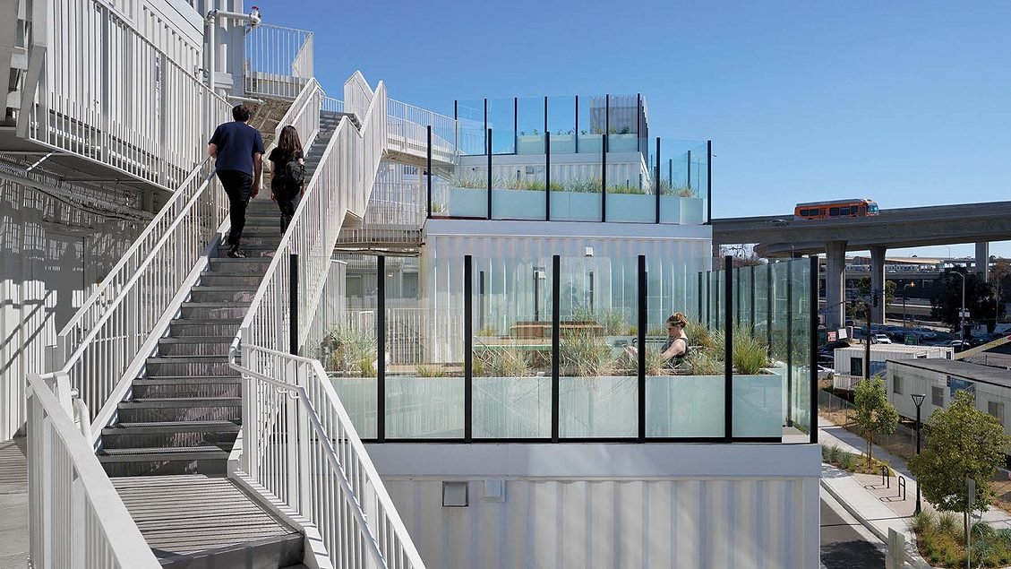 Công ty Lorcan O’Herlihy Architects có trụ sở tại Los Angeles, hợp tác với nhà phát triển phi lợi nhuận Holos Communities, đã thiết kế và xây dựng một dự án nhà ở 54 căn hộ trên một địa điểm hình tam giác đầy thách thức, ôm lấy một trong những nút giao thông đường cao tốc nhộn nhịp nhất thế giới. Lô đất này nằm trong số hơn 1.700 căn thuộc sở hữu của thành phố Los Angeles được cung cấp để phát triển với giá cả phải chăng, sau một loạt sáng kiến nhằm giải quyết tình trạng thiếu nhà ở đang diễn ra vào năm 2017. Dự án rộng 35.000 foot vuông bao gồm 16 tòa tháp so le bao gồm các đơn vị rộng 480 foot vuông theo mô-đun và xếp chồng lên nhau. Các khối này được kết nối bằng lối đi và cầu thang để thống nhất cấu trúc. Ở trung tâm, có một không gian xanh chung, và giữa khu nhà ở và nút giao đường cao tốc là một paseo—một lối đi dạo trồng cây, phía trước là các cửa hàng phục vụ đào tạo nghề, bán lẻ và các dịch vụ hỗ trợ. Trên một số mái nhà có các khu vườn cộng đồng để canh tác đô thị.