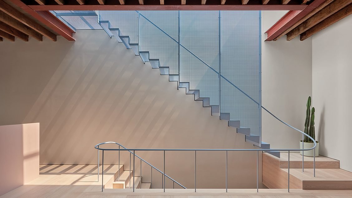 Để nguyên phần lớn kết cấu hiện có của tòa nhà, các nhà thiết kế đã thực hiện hai biện pháp can thiệp đặc trưng để ngay lập tức thu hút sự chú ý của du khách. Các tầng là đầu tiên. Một người bạn ở Đan Mạch đã giao việc thiết kế cho một nhà thầu trong thành phố, người này tình cờ có một số lượng lớn ván tro và không có mục đích sử dụng cụ thể nào; Rose và O’Neill đã đến và yêu cầu nhà thầu lắp đặt chúng như nguyên trạng, chỉ phủ một lớp dầu hạt lanh nhẹ để tăng thêm độ bóng. Thứ hai, và bắt mắt nhất, là cơ chế mà các kiến trúc sư muốn thực hiện giấc mơ tiệc nướng mùa hè của họ: đi qua một vết cắt mới trên trần dầm gỗ (khoảng trống được giằng bởi các dầm kết cấu thép mới), một cầu thang khổng lồ bằng polypropylen đục lỗ hiện dẫn lên mái nhà phía trên. Được cố định vào tường bằng các thanh mảnh và được cố định bằng các chốt hàn, hệ thống mô-đun tông màu xanh lam được chế tạo theo yêu cầu của các thành viên Brooklynites Argosy Designs. Trong một dự án tái sử dụng thích ứng với rất ít thứ còn lại để tái sử dụng, cầu thang trở thành một điểm nhấn ấn tượng.