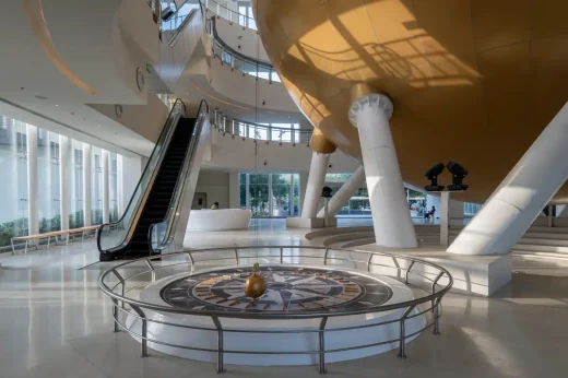 Cung thiên văn hình cầu, được chế tạo hoàn toàn bằng thép, được đỡ trên bốn cột hình chữ V, tạo ra ảo giác nổi bật về sự bay lên phía trên không gian bên dưới. Tâm nhĩ được bao bọc trong một lớp kính hiệu suất cao đảm bảo độ trong suốt, ánh sáng ban ngày xuyên qua và kết nối hình ảnh giữa các tầng. Bên ngoài, tòa nhà được bao bọc trong các màn chắn kim loại đục lỗ giúp che nắng và giảm hấp thụ nhiệt, đồng thời tạo ra mặt tiền động phản ứng với sự thay đổi của ánh sáng và bóng tối—củng cố đặc tính tương lai và trọng lượng nhẹ của phòng trưng bày.