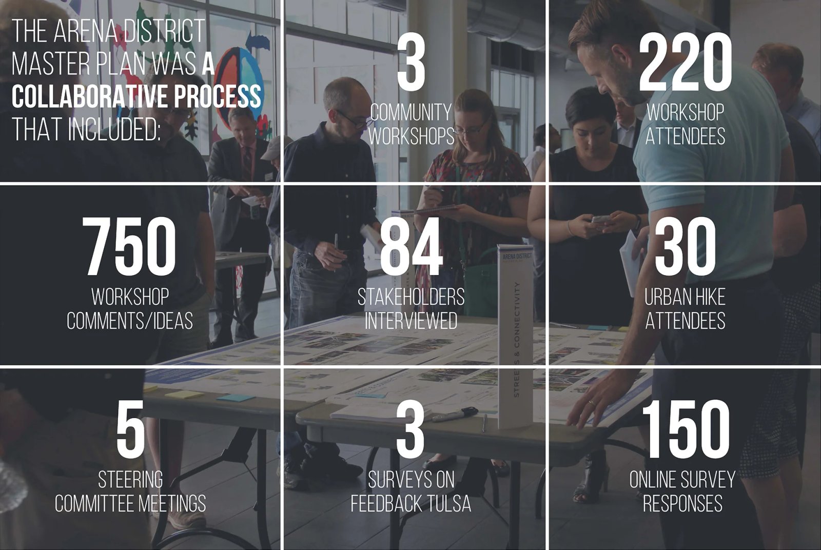 Ngày nay, người Tulsan có cơ hội làm lại Arena District và biến nó trở thành một phần bản sắc của cộng đồng. Kế hoạch Tổng thể trình bày một khuôn khổ các khuyến nghị đầu tư xúc tác và chiến lược tài trợ để đạt được tầm nhìn, đồng thời giúp hướng dẫn Thành phố Tulsa và các đối tác trong việc phát triển các cải tiến đối với khu vực công của quận và khuyến khích phát triển tư nhân.