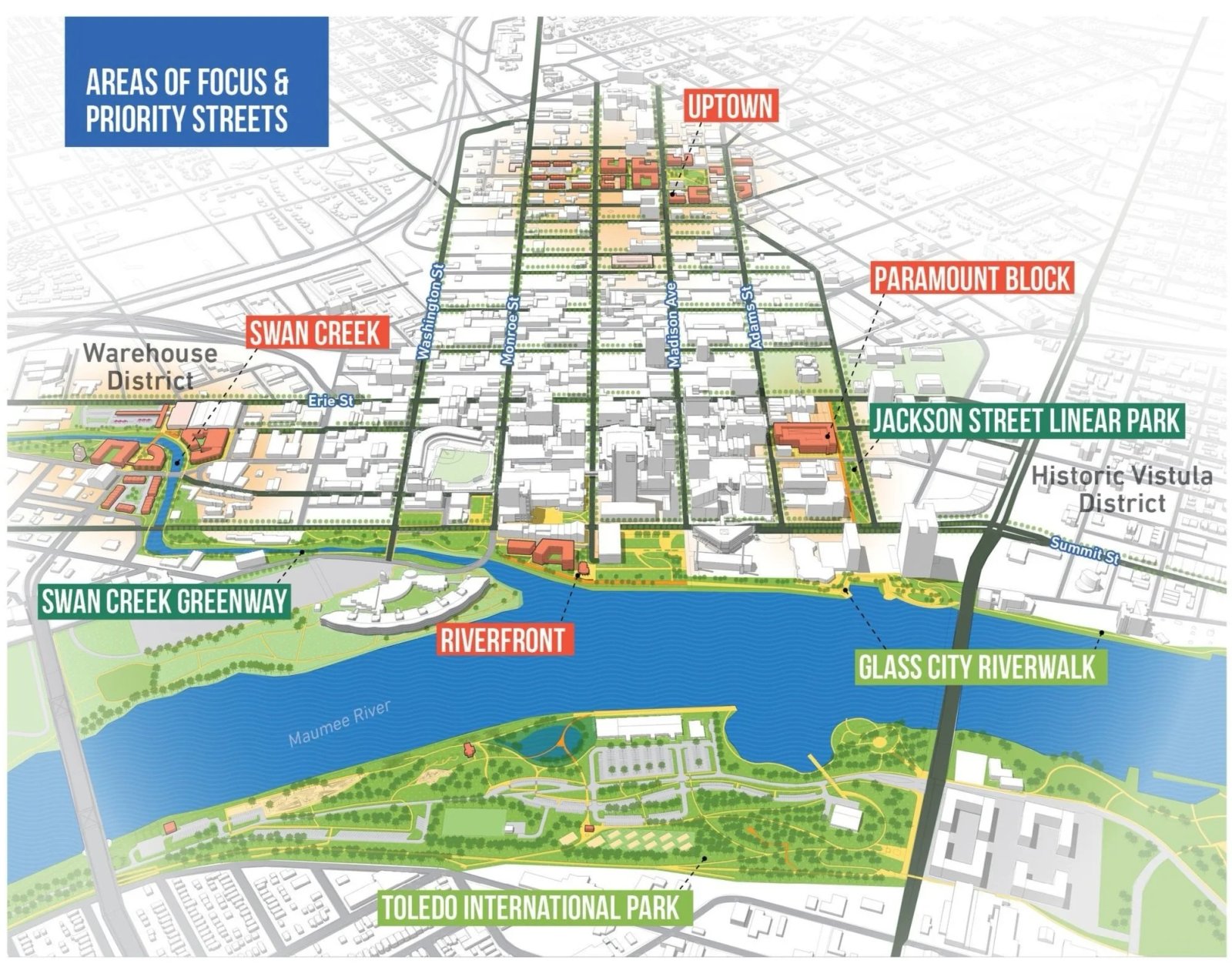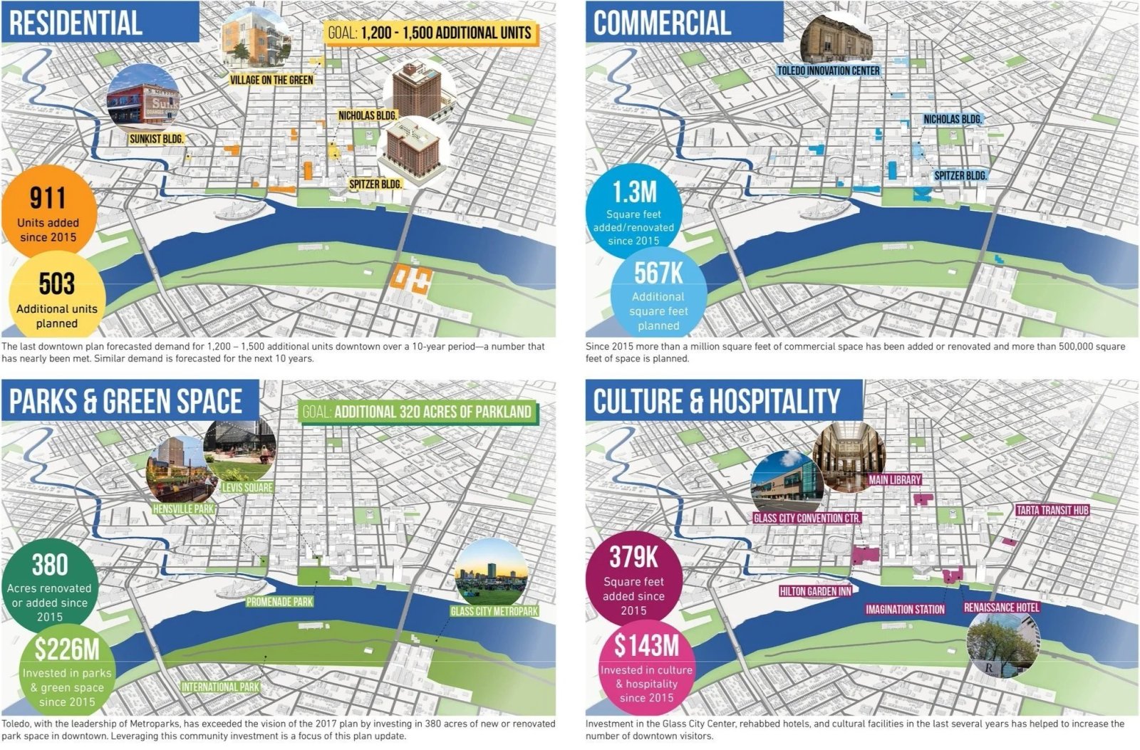 Việc thực hiện Cập nhật Quy hoạch Tổng thể đã được tiến hành. Việc cải thiện cảnh quan đường phố và khả năng di chuyển của RAISE Grant sẽ bắt đầu ở Uptown vào cuối năm nay, trong khi Đường đi bộ ven sông Glass City đang mở rộng để kết nối với East Toledo. Công việc tiếp tục nhằm khôi phục Chợ Nông dân và điều tra sơ bộ về sự phát triển của Swan Creek.