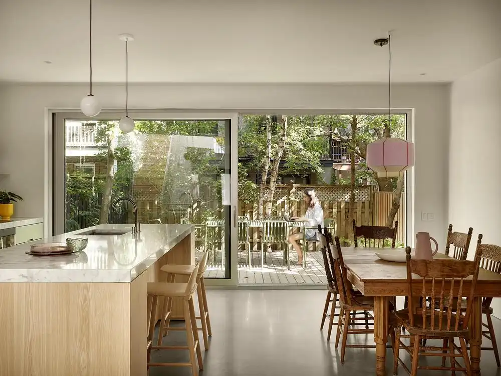 Ánh sáng tự nhiên tổ chức nội thất. Cầu thang trung tâm có cửa sổ trần rộng rãi mang ánh sáng ban ngày vào sâu trong không gian, trong khi các khe hở lớn ở phía sau kết nối không gian sinh hoạt chính với khu vườn và sân hiên. Mặc dù có diện tích hạn chế và định hướng đầy thách thức, dự án vẫn ưu tiên sự rõ ràng về không gian, sự lưu thông chất lỏng và tính liên tục về mặt thị giác.