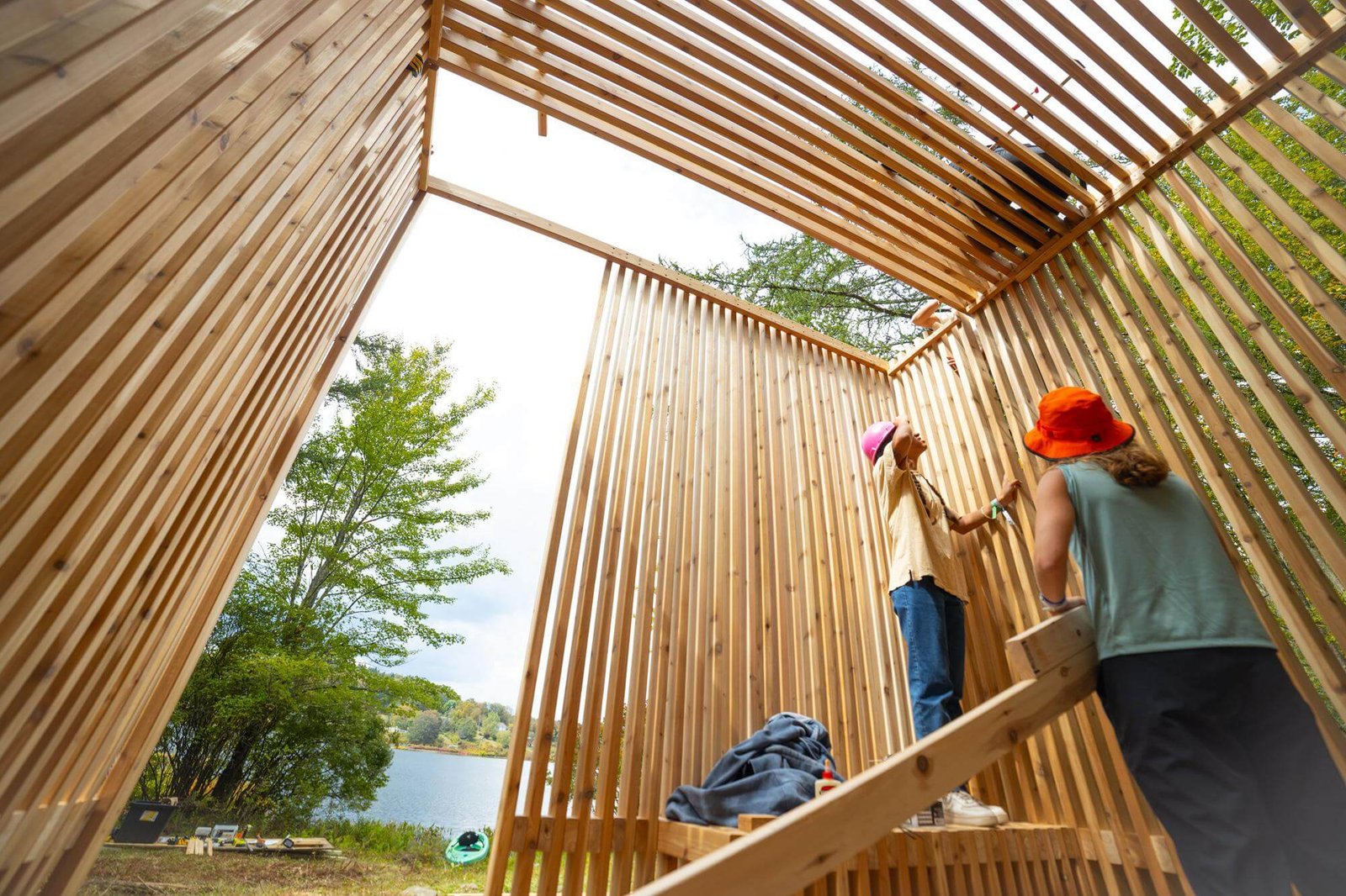 Polylith của Ekin Erar (Syracuse) và Lawson Spencer (Cornell), cùng các sinh viên Cornell Varun Gandhi, Jacob Gibbons, Seh Eun Emily Hong, Austin Johnson, Torben Karl, Yuji Kitamura, Brooke Kenworthy, Amina Lahham, Bo Li, Edozie Onumonu Kobe Phillips, Helen Bennett, Katharine Marr, Saffiyah Subhan-Khan, Clark Dong. (Breyden Anderson/Lễ hội Kiến trúc và Nghệ thuật Rừng Bethel)