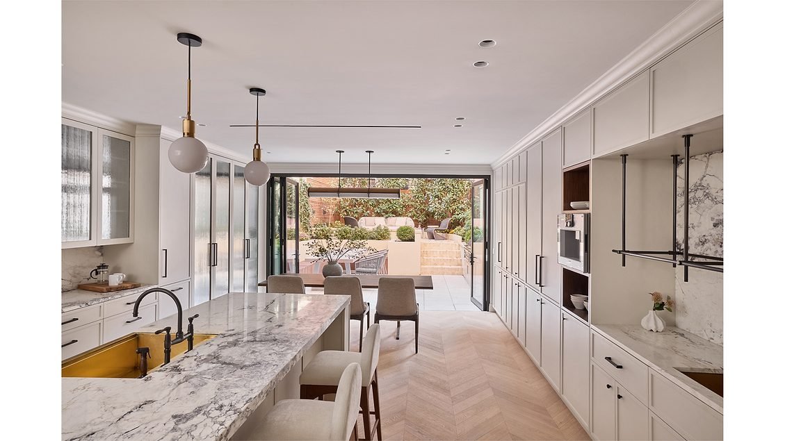 Đặc biệt, nhà bếp nằm ở tầng vườn có đặc điểm breccia capraia đá cẩm thạch, các yếu tố đặt riêng và các điểm nhấn bằng đồng. Một hòn đảo chạy song song với các quầy và được bao phủ bởi ba chiếc đèn treo hình quả cầu, có bồn rửa bằng đồng bắt mắt với vòi bằng đồng tối màu. Tủ và mui xe của L’Atelier Paris màu xanh đậm với đường viền bằng đồng sáng bóng đặt cạnh đá trắng ấm áp và tủ được chế tạo riêng. Bồn rửa quầy bar, máy pha cà phê tích hợp, máy làm mát rượu và lò nướng nằm dọc theo bức tường đối diện.
