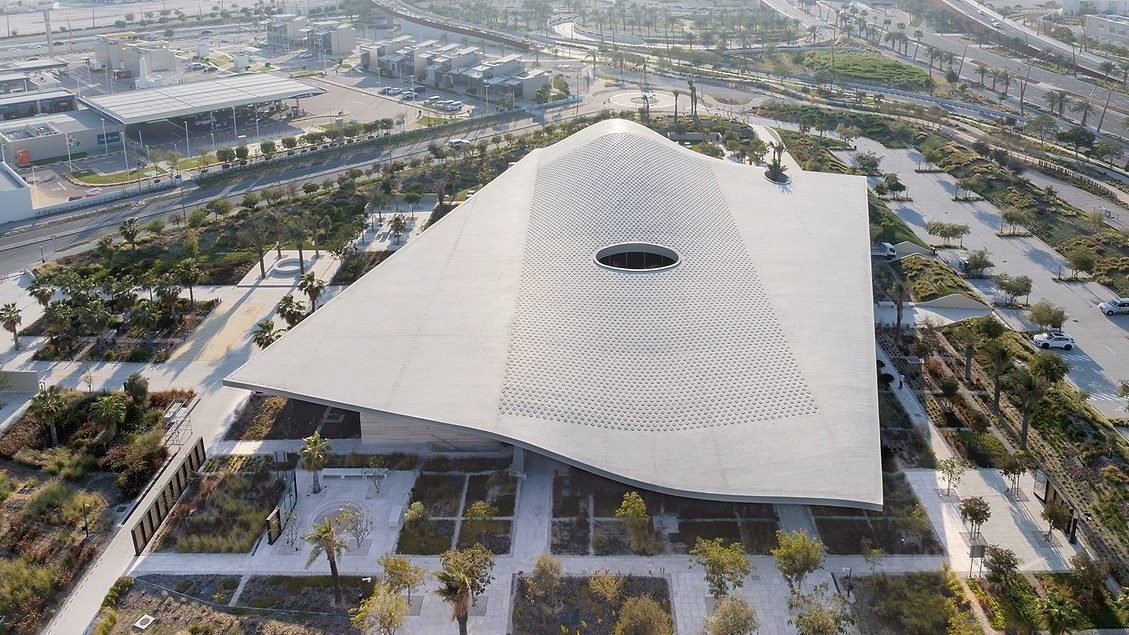 Mặt phẳng mái — dày khoảng 3 feet rưỡi — được đóng khung bằng các thành phần thép uốn cong, trong khi mạng lưới các dầm thứ cấp và thứ ba thẳng cũng như xà gồ nhích gần hơn đến độ cong dự định. Phía trên chúng, các tấm cách nhiệt và lớp bê tông tạo thành nền cho lớp ngoài cùng: một cánh đồng gồm các phiến đá vôi được cắt theo kích thước từ Oman. Một dãy 5.488 cửa sổ mái đã hoàn tất việc lắp ráp. Diller nói: “Một ý tưởng được áp dụng từ nghiên cứu về tiền lệ lịch sử của chúng tôi là ý tưởng tuyệt vời. “Và chúng tôi đã hoàn thành nó không phải thông qua trang trí hay hoa văn hữu hình mà thông qua ánh sáng.” Những khe hở tròn này—trên trần nhà rộng hơn so với trên mái nhà, để giảm thiểu sự hấp thụ nhiệt—làm trung hòa ánh nắng gay gắt gần xích đạo trong khi tràn ngập sảnh chính trong ánh sáng khuếch tán gần như thiên đường.