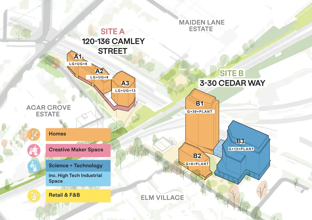 Quy hoạch tổng thể của địa điểm này tạo ra một nơi để sống, làm việc và phát triển, với những con đường mới và không gian xanh kết nối địa điểm này với các khu dân cư xung quanh bao gồm Camden Town, King’s Cross, Agar Grove, Elm Village và Maiden Lane. Các ngôi nhà được bổ sung bởi không gian sáng tạo, đơn vị kinh doanh giá cả phải chăng và trung tâm khoa học và công nghệ linh hoạt được thiết kế để hỗ trợ các lĩnh vực đổi mới đang phát triển nhanh chóng của Vương quốc Anh. Một “không gian hòa trộn” cộng đồng sẽ tổ chức các hoạt động học tập, đào tạo và gắn kết, bao gồm các cơ hội liên quan đến chương trình STEM for Life của Lateral.