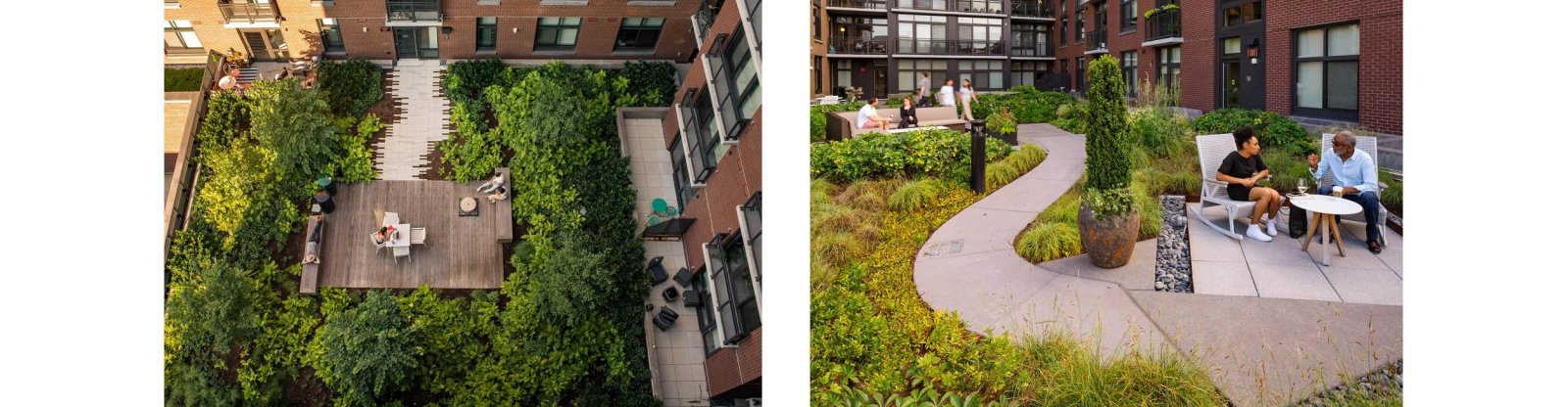 Hai sân thượng lớn hơn hướng tầm nhìn ra thành phố. Được hình dung như một không gian năng động, sân hiên bên hồ bơi được bao bọc bởi một giàn mắt cáo điêu khắc mang lại bóng mát và sự riêng tư cho các hoạt động gần đó. Sân hiên phía tây cũng có tầm nhìn, nơi người dùng có thể ngắm nhìn cảnh hoàng hôn bao quát thành phố trong khi sưởi ấm xung quanh hố lửa. Sân hiên phía đông bao gồm không gian ăn uống và nướng thịt rộng rãi cũng như khu vực bãi cỏ tổng hợp rộng lớn có thể được sử dụng để chiếu phim ngoài trời.