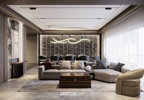 Với cảm hứng đến từ sự kết hợp giữa phong cách hiện đại và luxury, Decox đã chọn lựa tone trắng – gỗ chủ đạo, nhấn điểm với những chi tiết mạ vàng đồng chạy dọc trên trần, tường và nội thất để mang đến một tổng thể sang trọng, tinh tế và cá tính. Do sử dụng khá nhiều gam màu trầm và lạnh, nên ánh đèn vàng hắt sẽ là giải pháp cân bằng giúp không gian thêm phần ấm cúng.