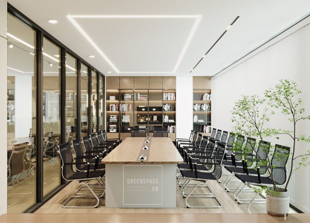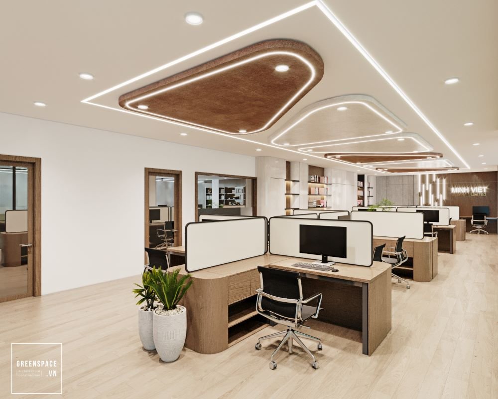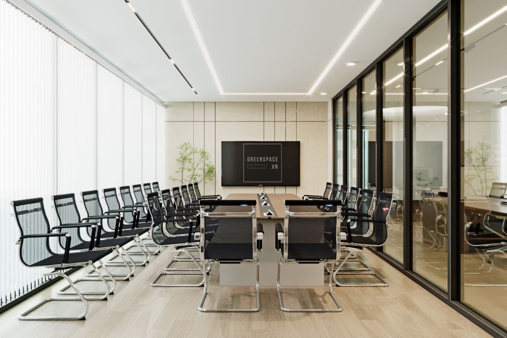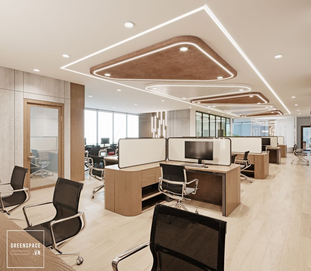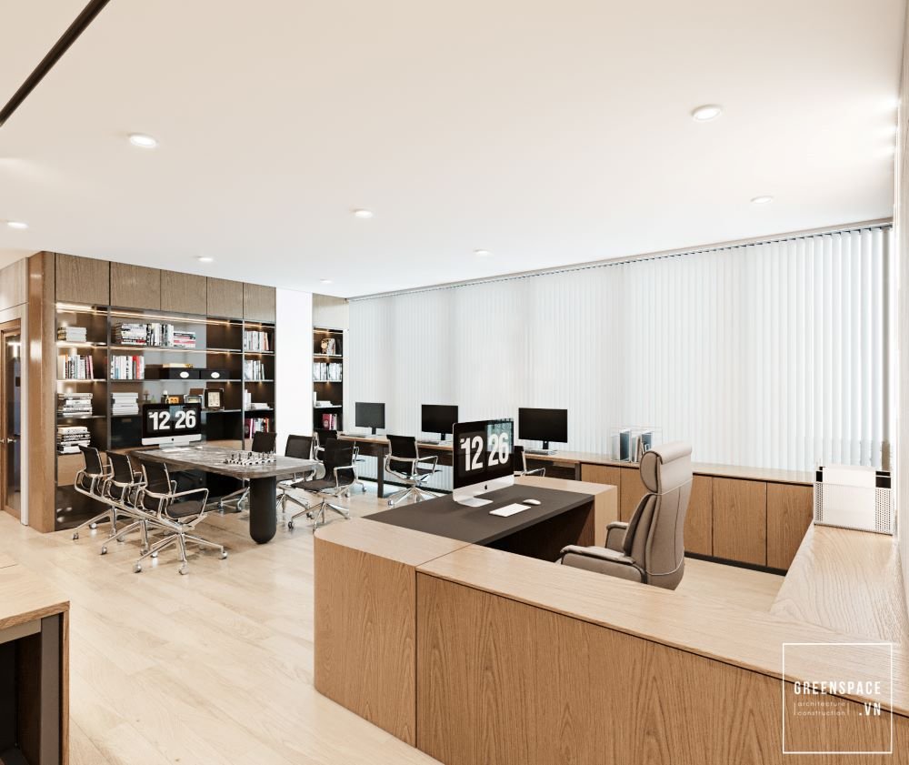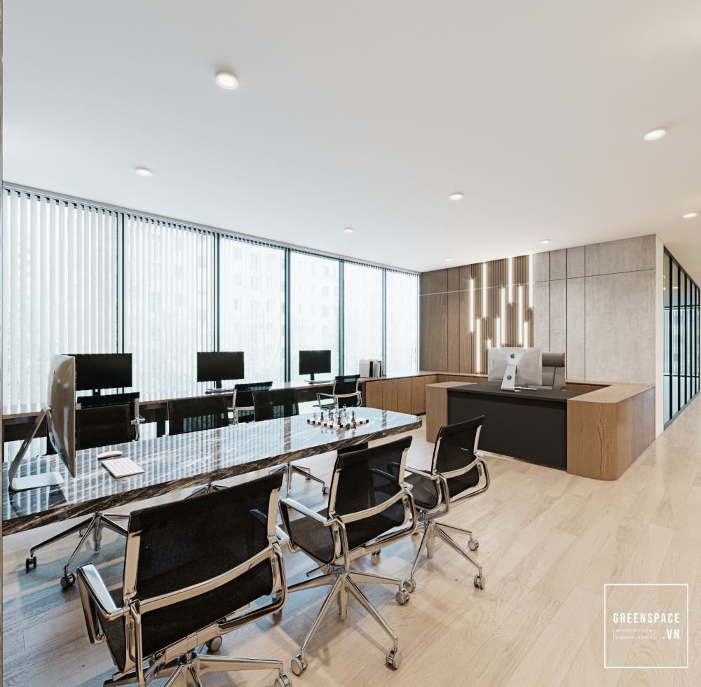 Không gian văn phòng được thiết kế hiện đại với tông màu gỗ ấm áp. Ánh sáng tự nhiên chan hòa tạo cảm giác rộng rãi và thoải mái. Nội thất tối giản nhưng đầy đủ công năng cho mọi nhu cầu làm việc. Phòng họp sang trọng với kính trong suốt kết hợp cây xanh tinh tế. Khu làm việc mở giúp tăng sự kết nối giữa các nhân viên.