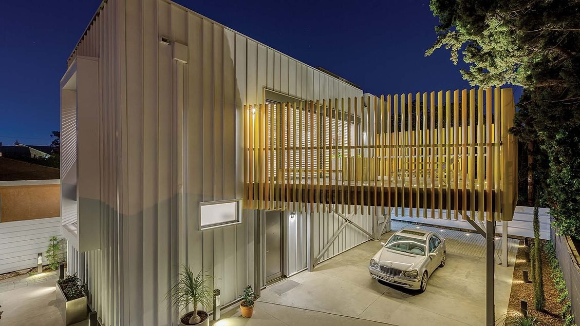Với hầu hết các dự án của mình ở New England, OPAL có thể đưa ra quan điểm về thiết kế các dự án Nhà thụ động ở các khu vực khác nhau. Riley Pratt, đối tác thiết kế của OPAL, cho biết mặc dù các tòa nhà của công ty thường ưa chuộng các hình thức nhỏ gọn để tiết kiệm năng lượng nhưng khí hậu Nam California cho phép diện tích bề mặt bên ngoài rộng rãi hơn. Ông nói, một dự án Nhà thụ động ở LA sẽ yêu cầu ít vật liệu cách nhiệt hơn và nên kết hợp bóng mát để tránh tăng nhiệt. Theo đó, sơ đồ cạnh tranh hai tầng, ba phòng ngủ của công ty có các khối hình hộp xếp chồng lên nhau xác định không gian ngoài trời, bao gồm sân trong và sân thượng, được bảo vệ bởi giàn che bằng thép chống chịu thời tiết.