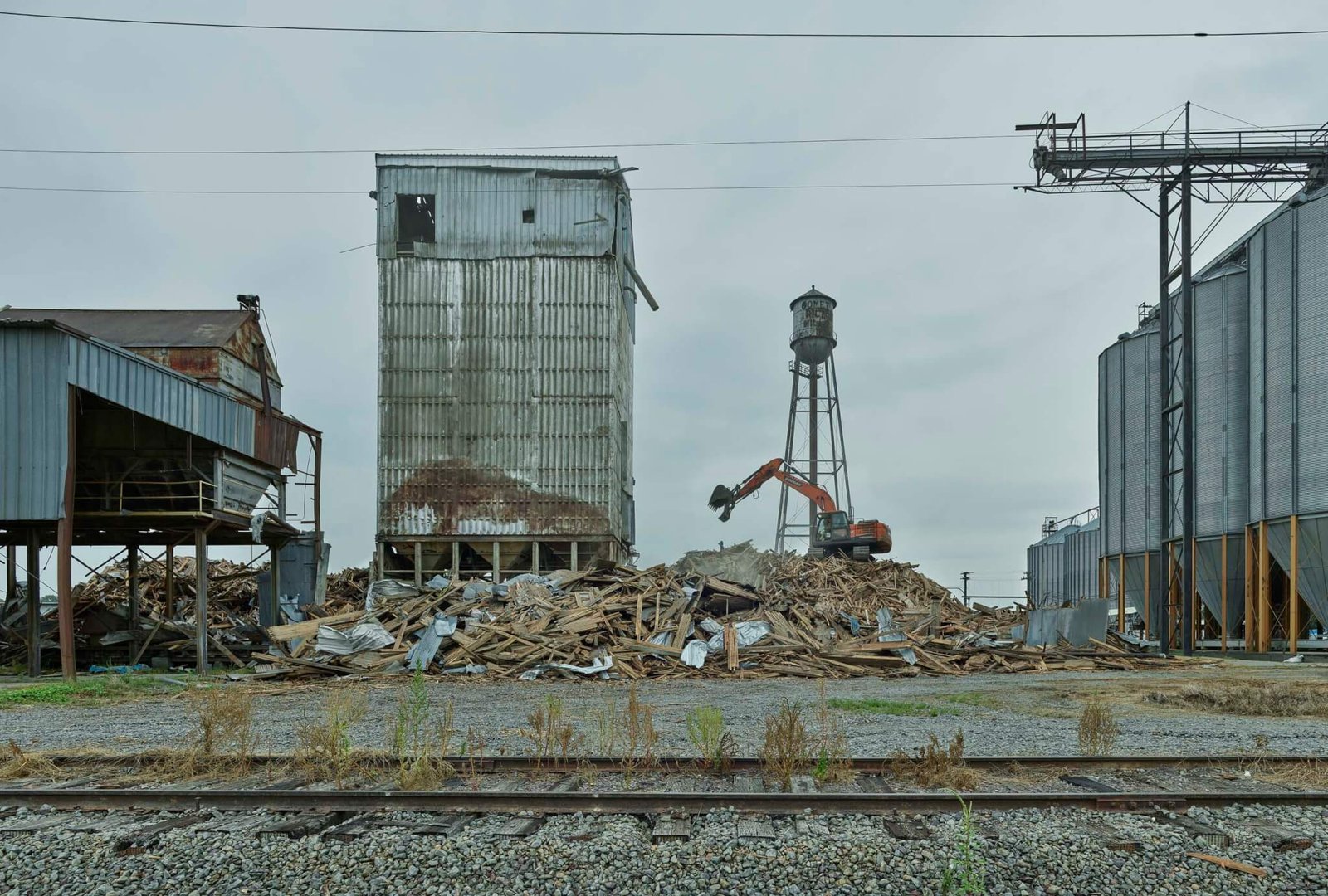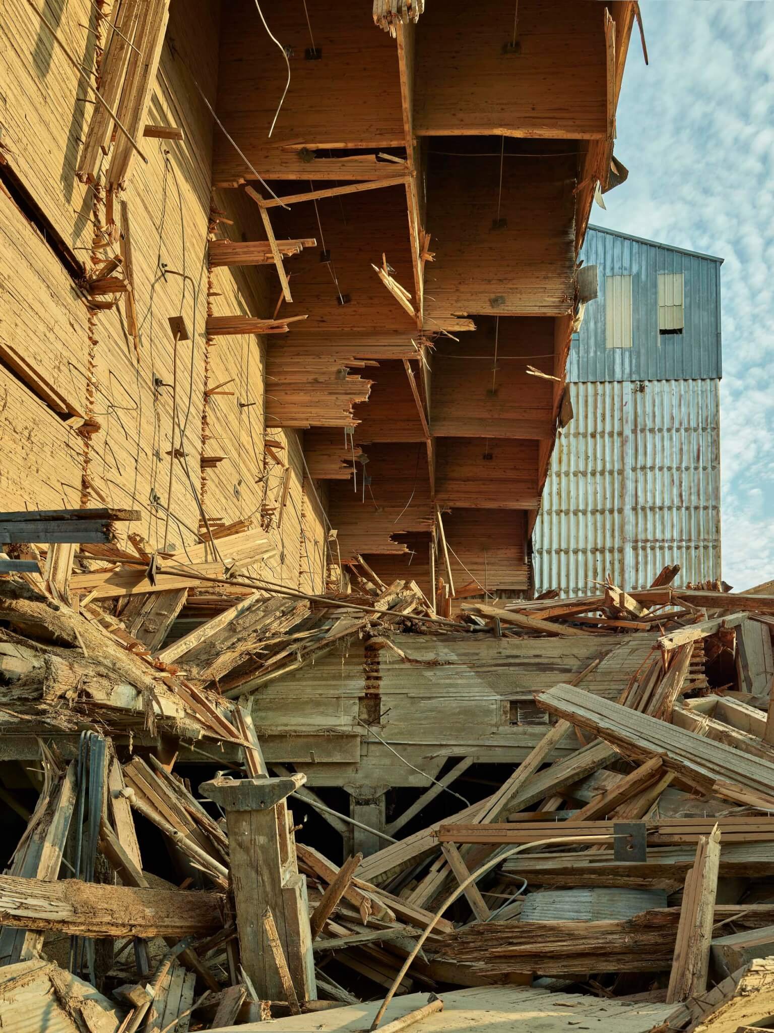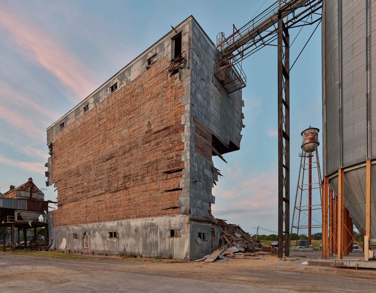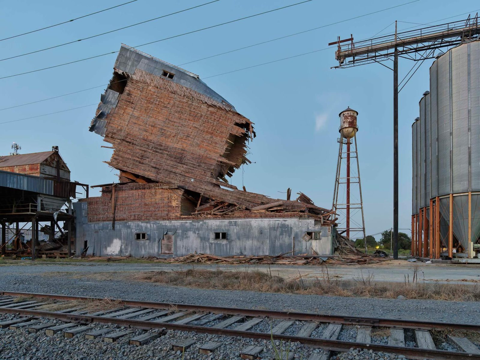 Gần đó là kho chứa gạo chứa 31 thùng đã hơn 100 năm tuổi. Đó là chiếc duy nhất giống như vậy còn sót lại trong bang. Mặt tiền nhìn ra đường ray trông giống như một bức tranh khổng lồ của Cy Twombly hoặc Sol LeWitt. Năm ngoái, tôi được biết nhà máy sắp ngừng hoạt động. Tôi đến gặp chủ nhà máy với ý tưởng loại bỏ và giữ lại các tấm thép mạ kẽm. Khi tắt các tấm này, các thùng gỗ lộ ra và trở thành một công trình lắp đặt tạm thời mới. Khi việc phá dỡ bắt đầu, tôi đã có mặt tại chỗ để ghi lại quá trình này hàng ngày.